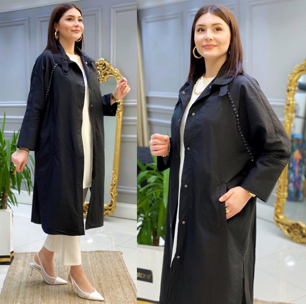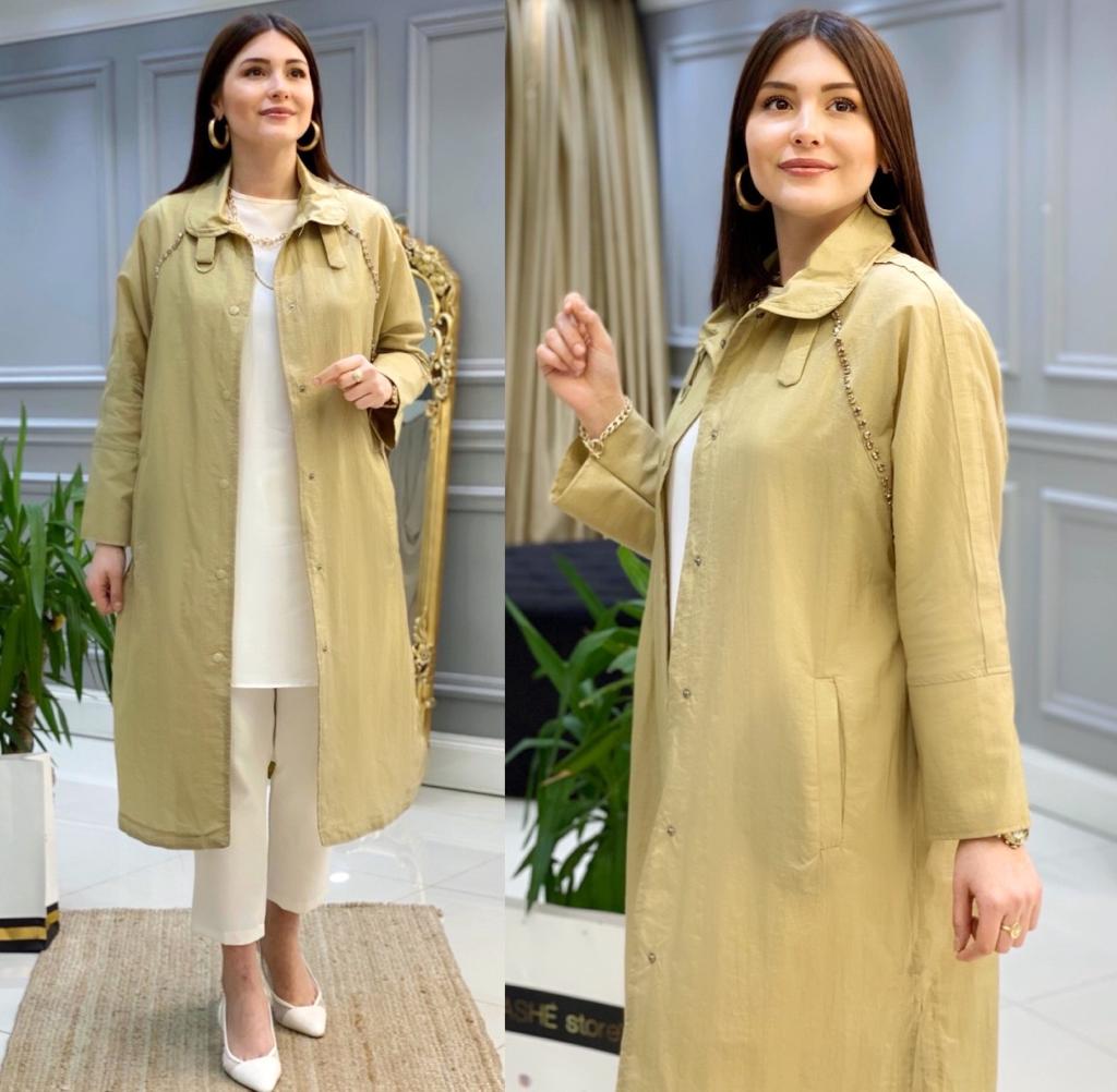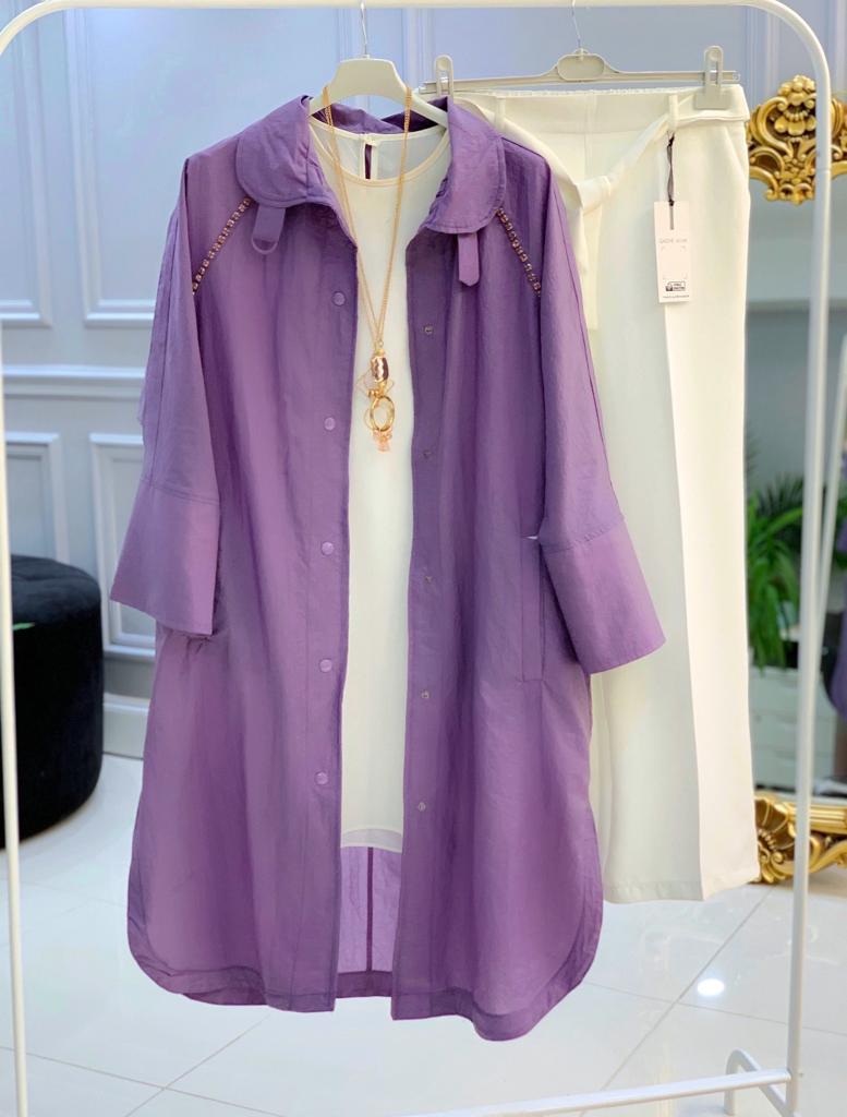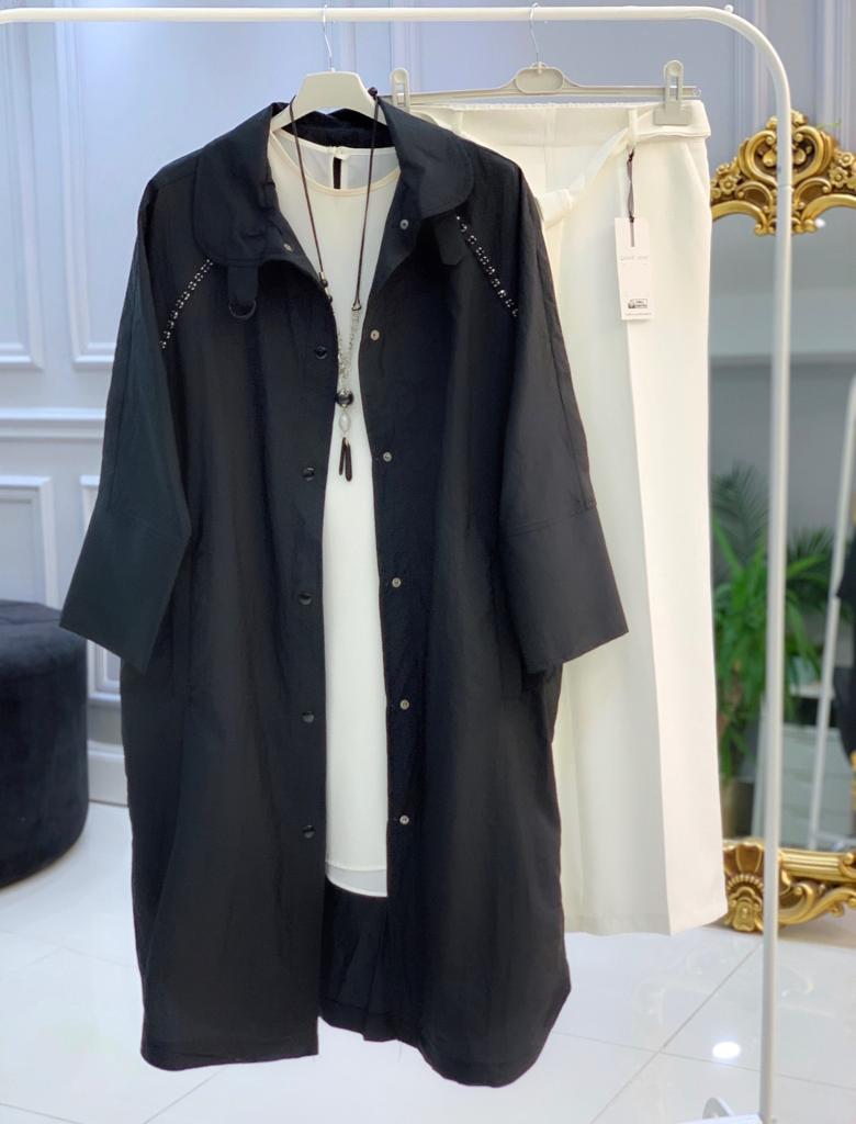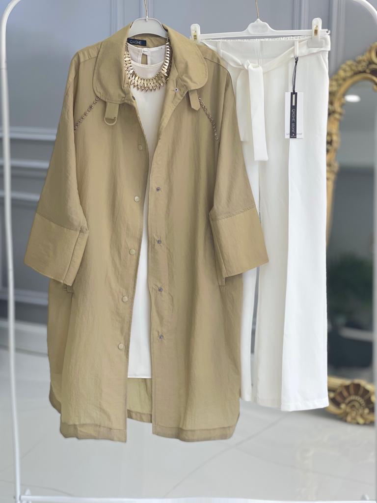 Ürün bilgileri: Paraşüt kumaştır. Omuz kısmından göğüs kısmına kadar taş detayları mevcuttur. Boydan boya çıt çıtlıdır. Cep kısımları mevcuttur.