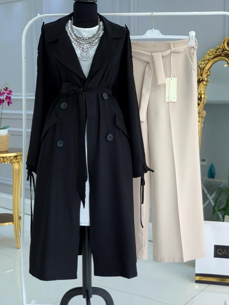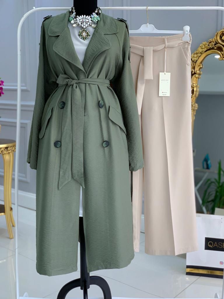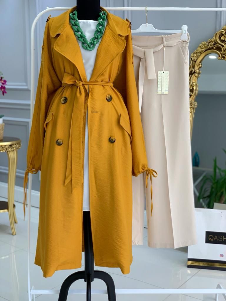 Trenç modelimizin omuz kısımları düğmeli kemer detaylıdır. Kolları sıkmalı ip detaylıdır.