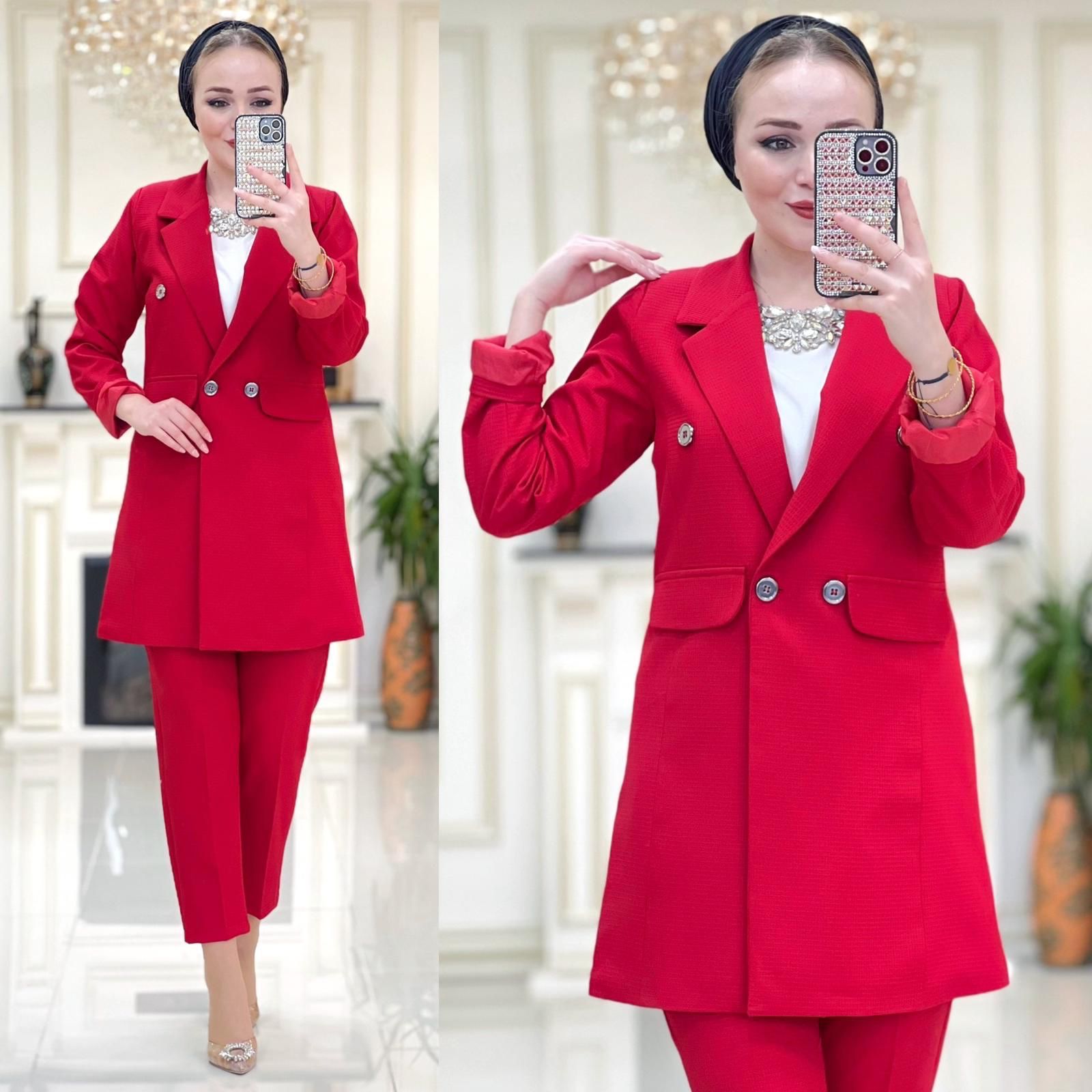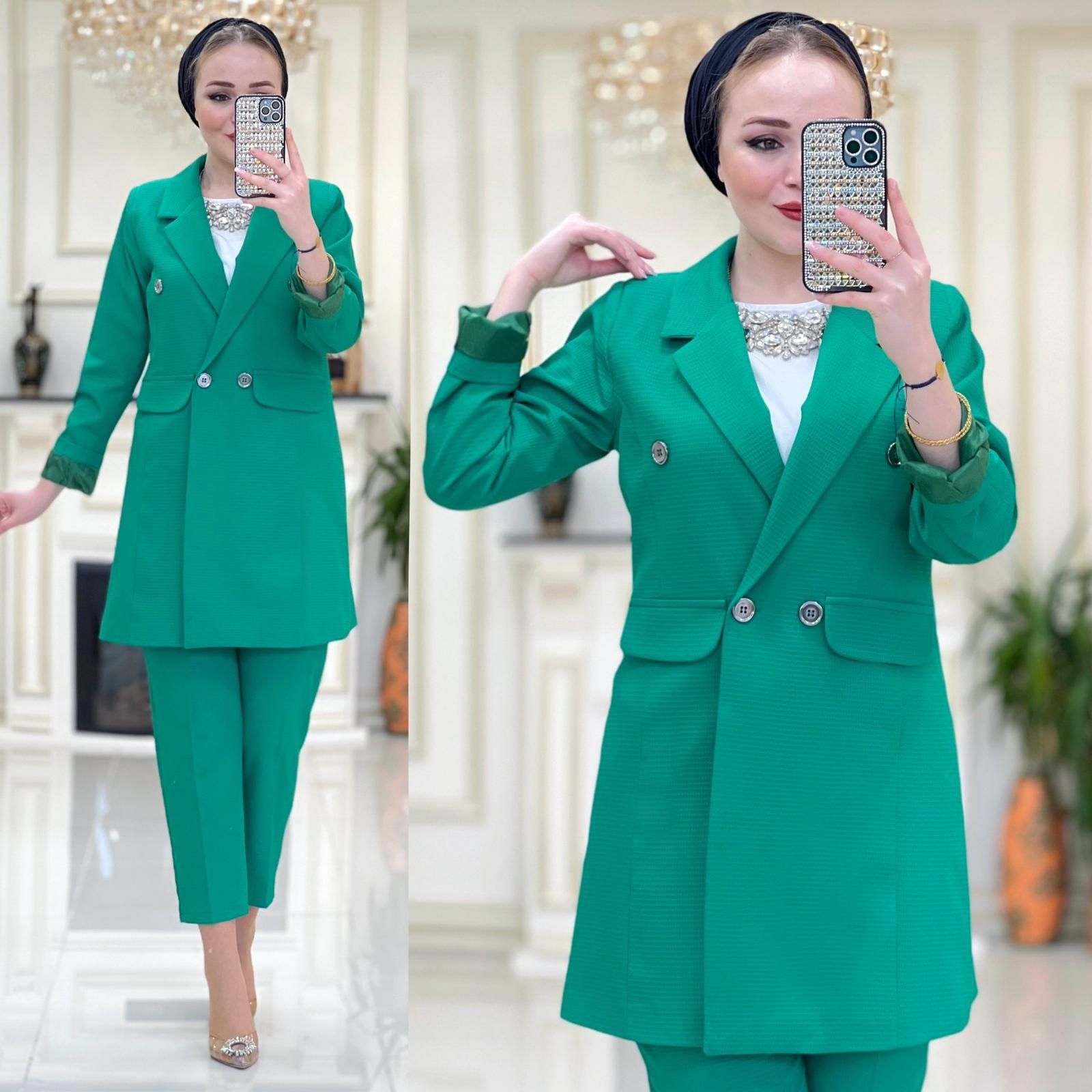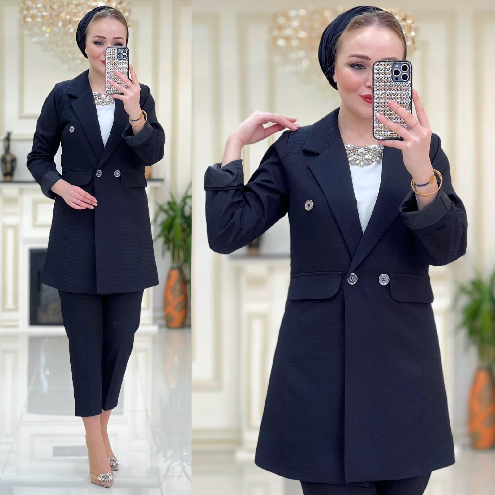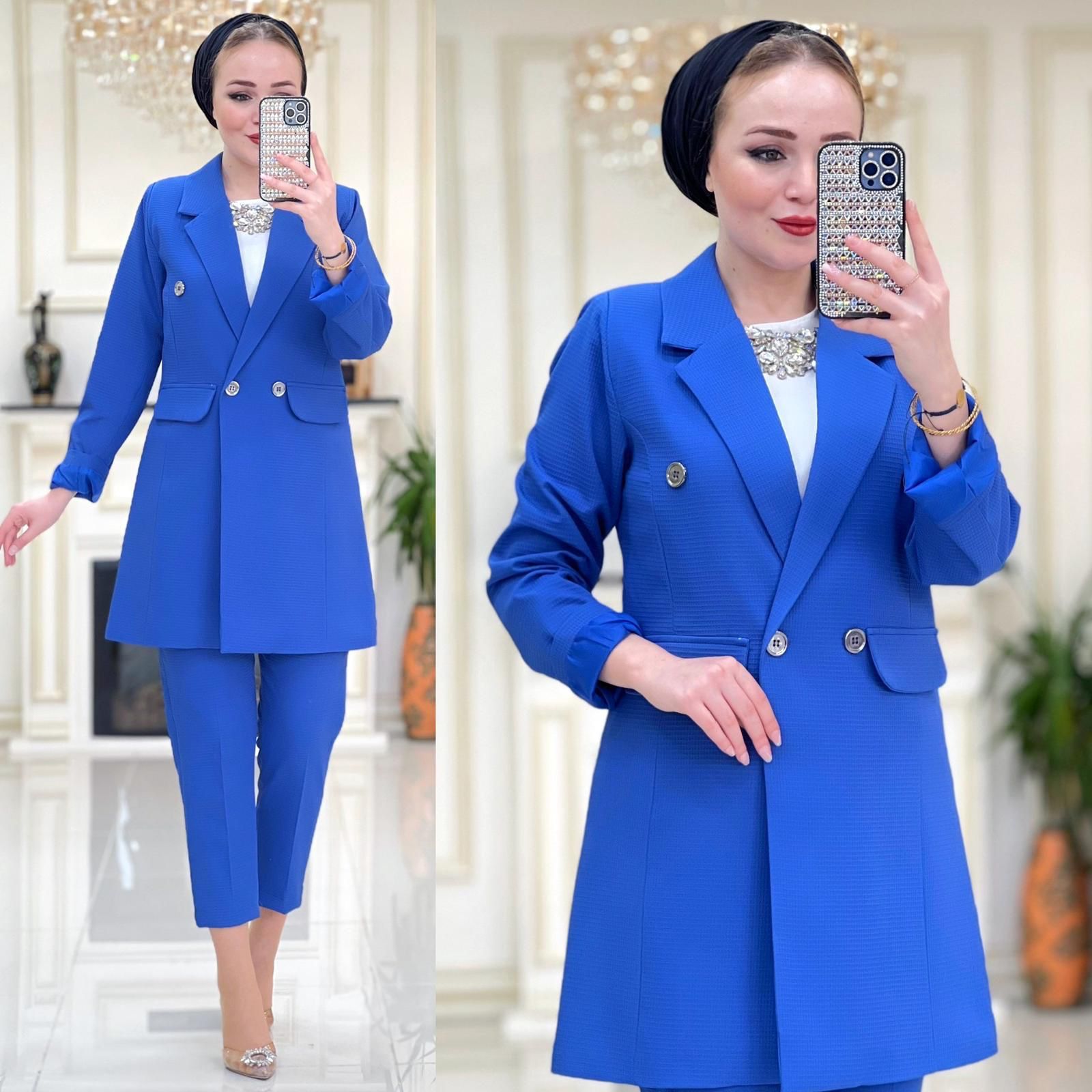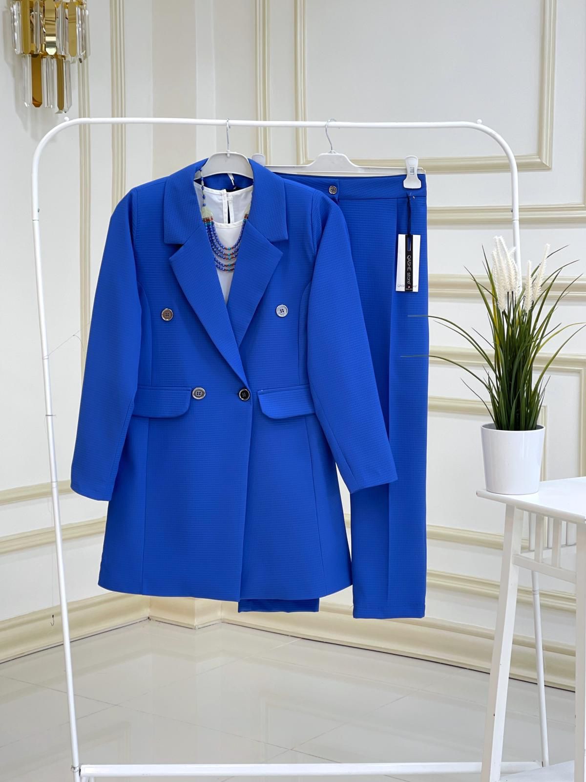 1. Sınıf Petek Krep Kumaştır. 38 Beden Ölçüsü: Ceket boy: 85 cm Omuz: 38 cm Pantolon boy: 90 cm Pantolon önden düğmeli fermuarlıdır.