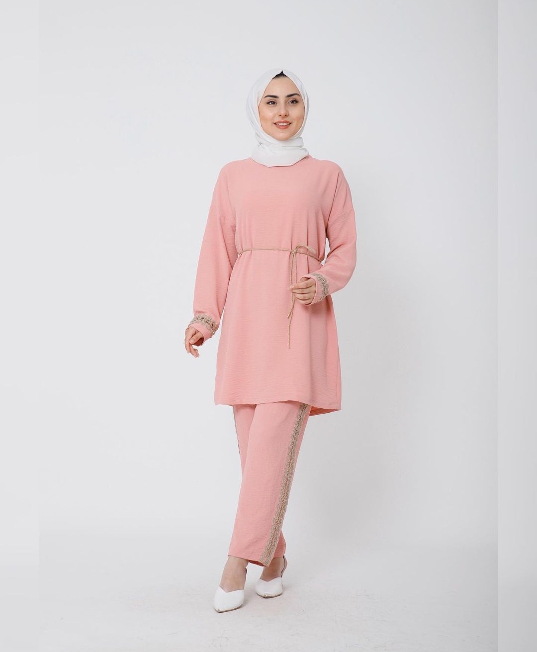 İp kemer detaylı yan ve kol ağızı hasır detaylı alt bel lastikli