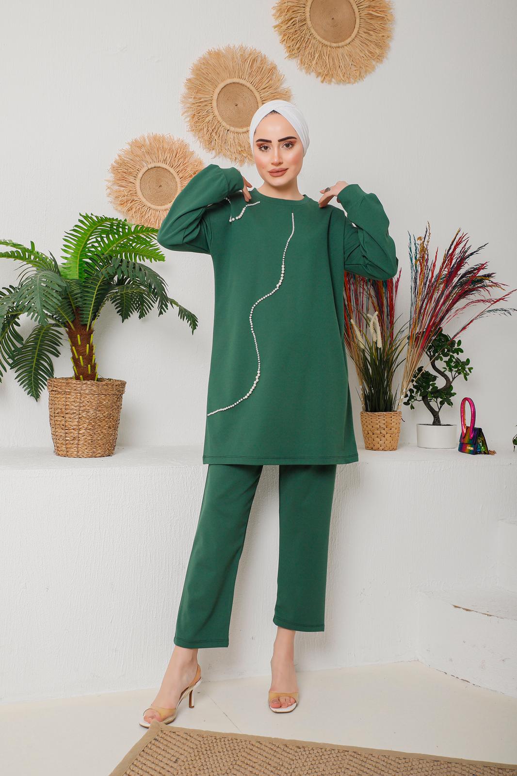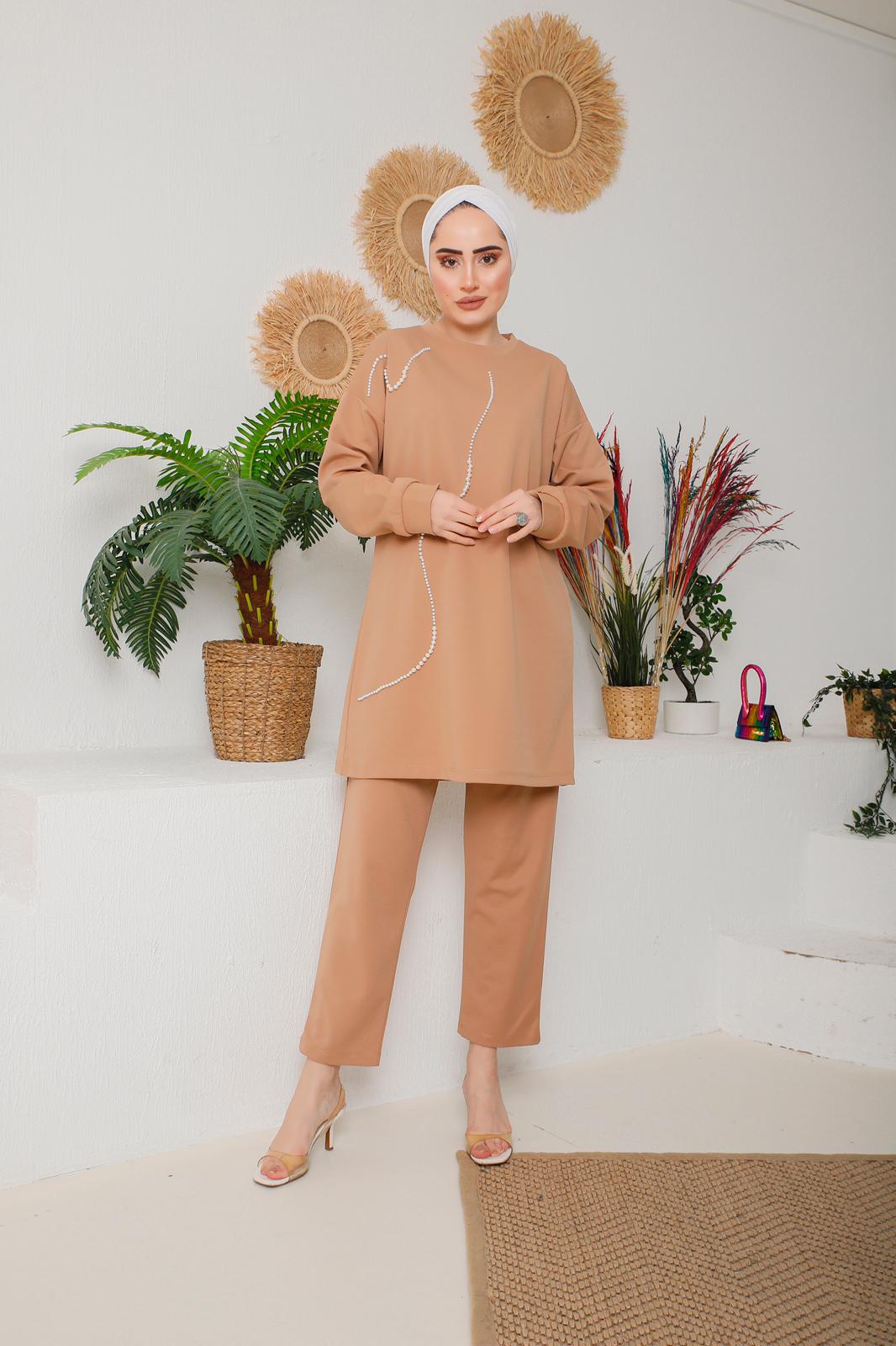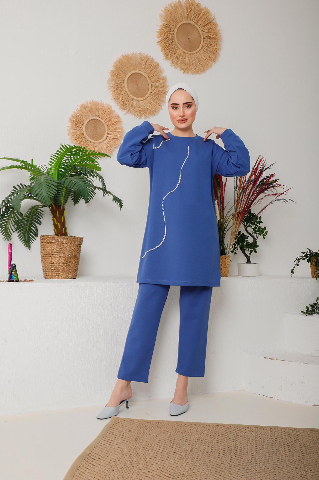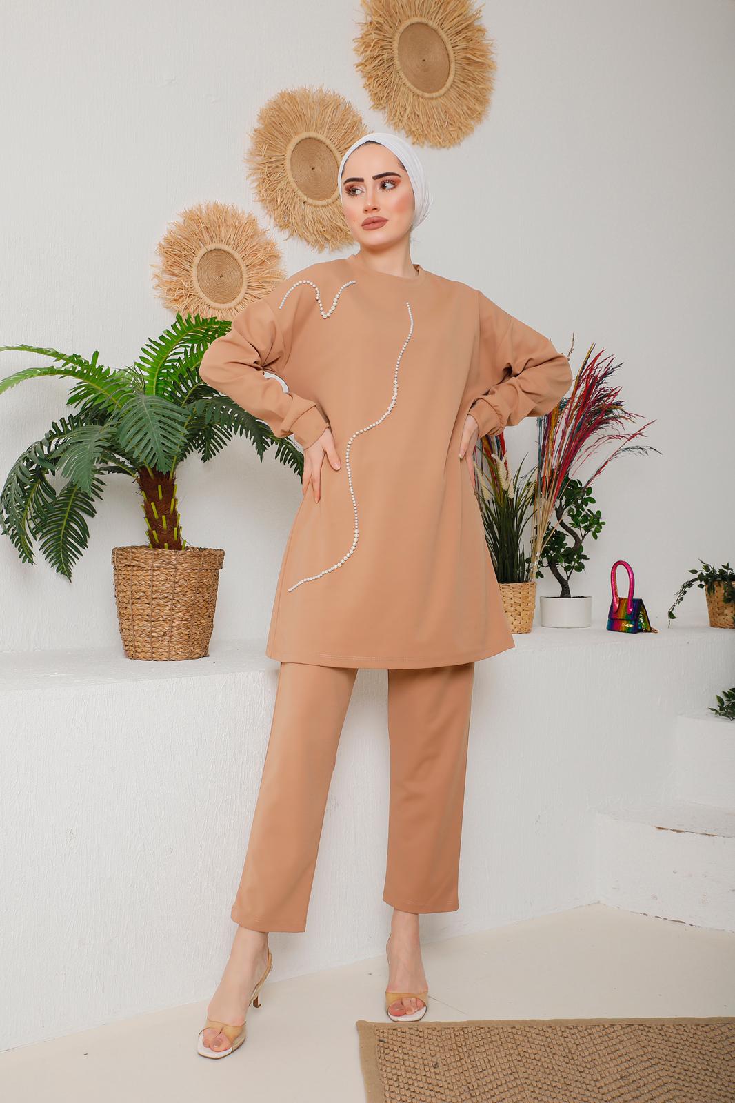Kol ucu, kendi kumasindan mansetli yuvarlak yaka önde dalgalı inci geçişli inciler çakmalı düşme yapmaz