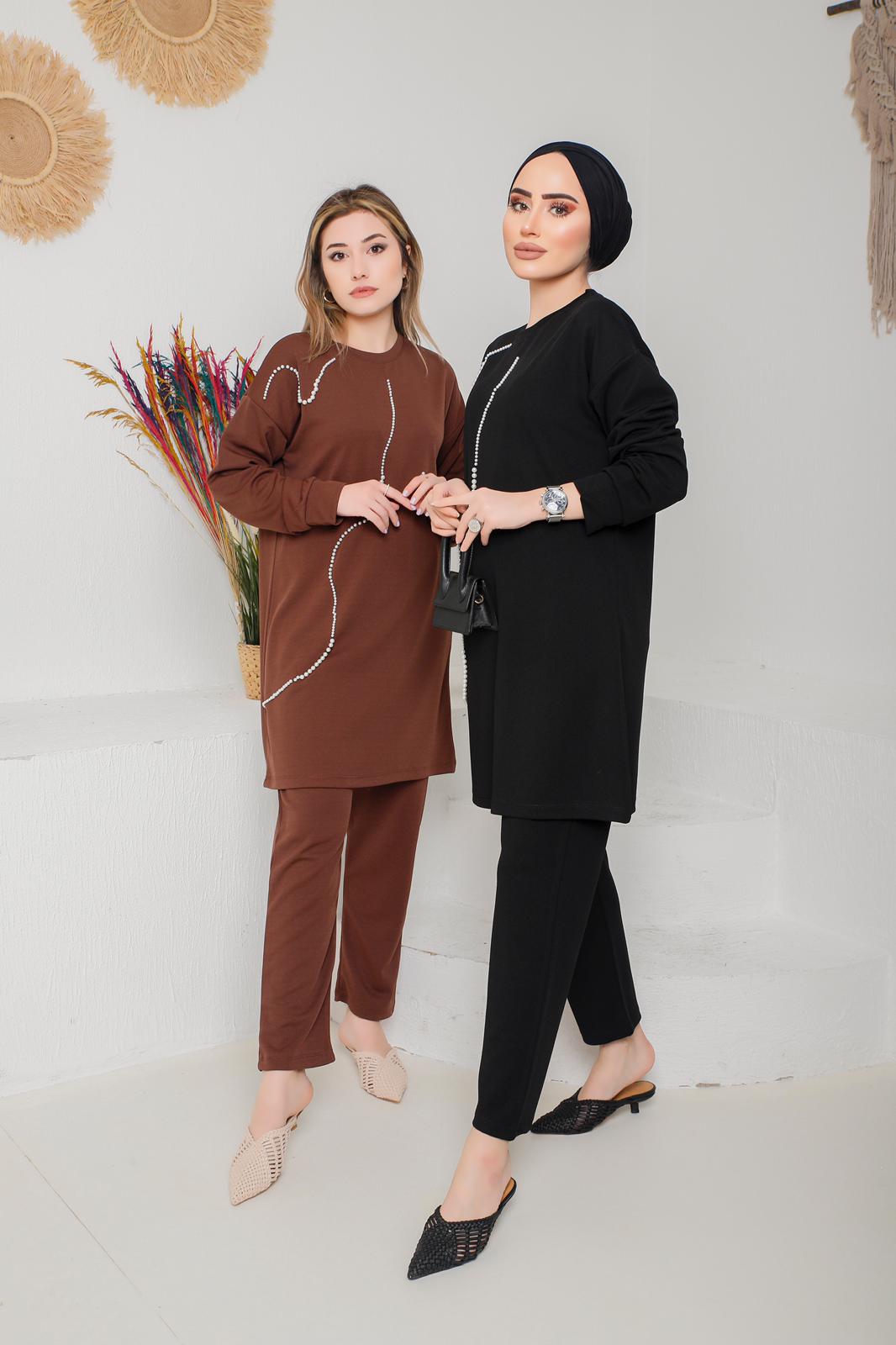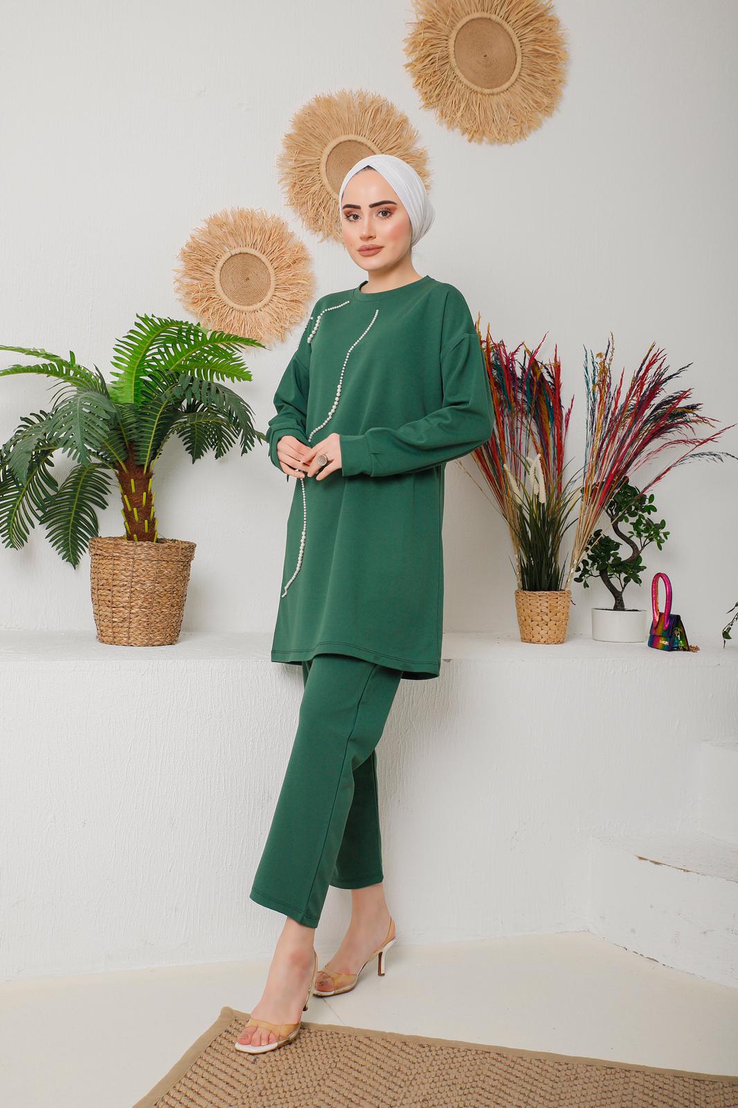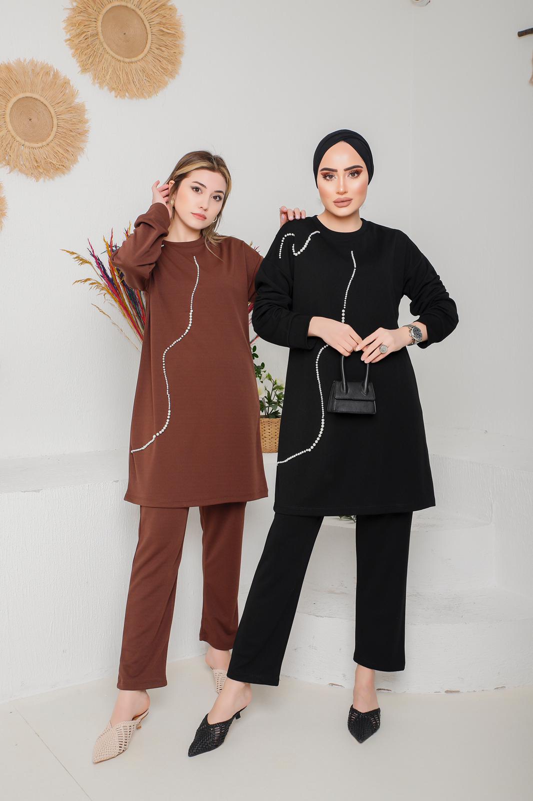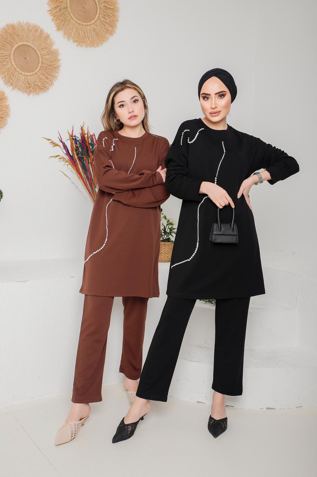 Kol ucu, kendi kumasindan mansetli yuvarlak yaka önde dalgalı inci geçişli inciler çakmalı düşme yapmaz