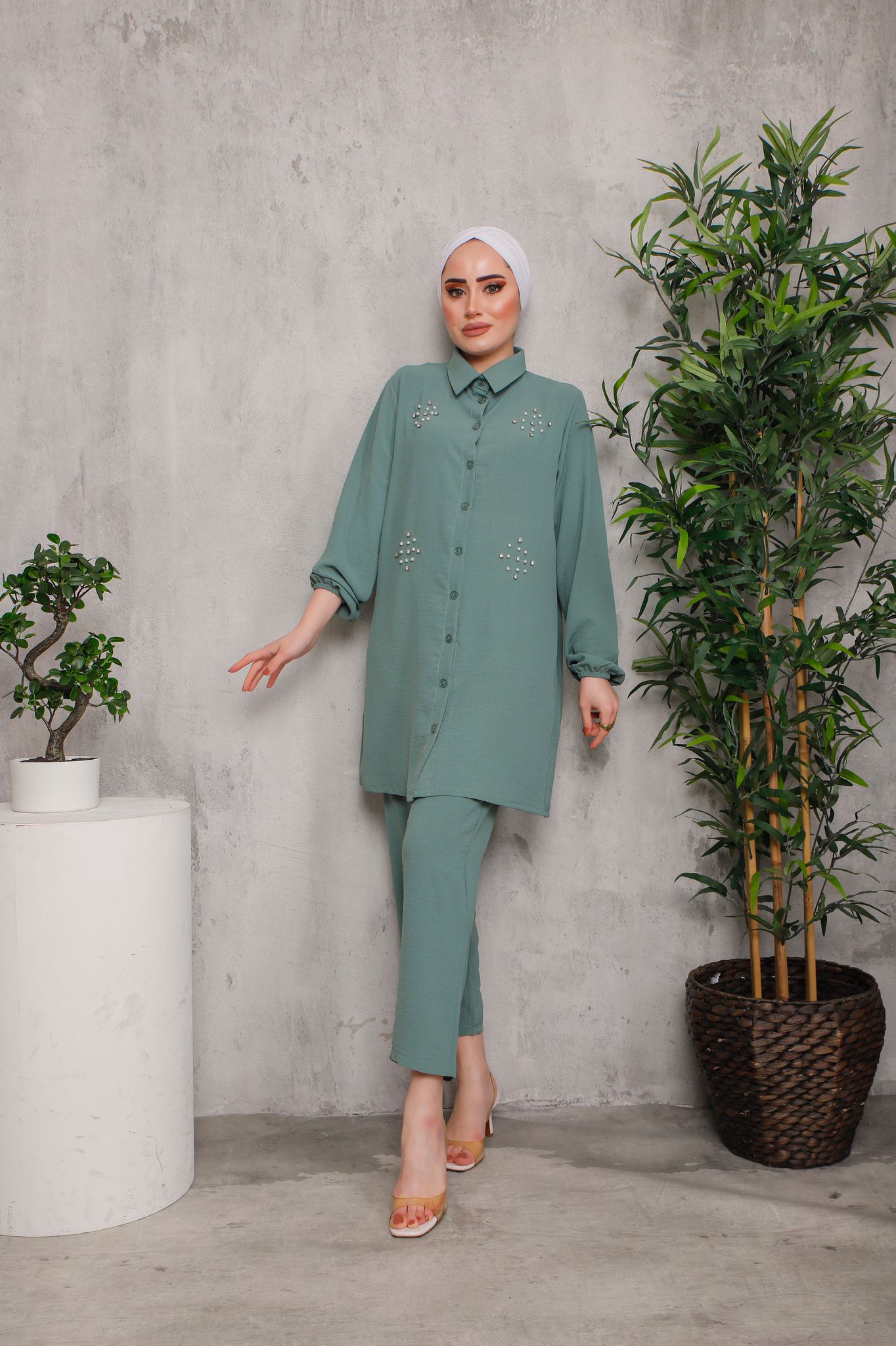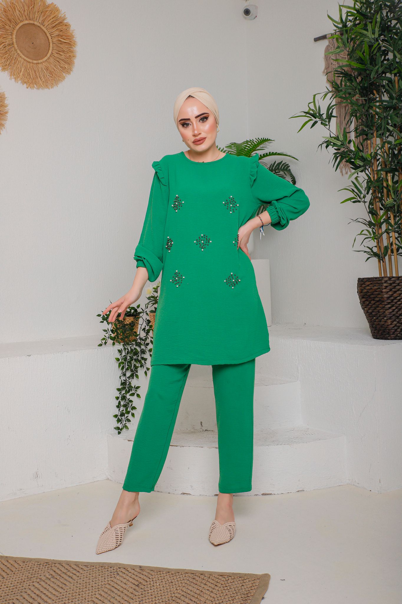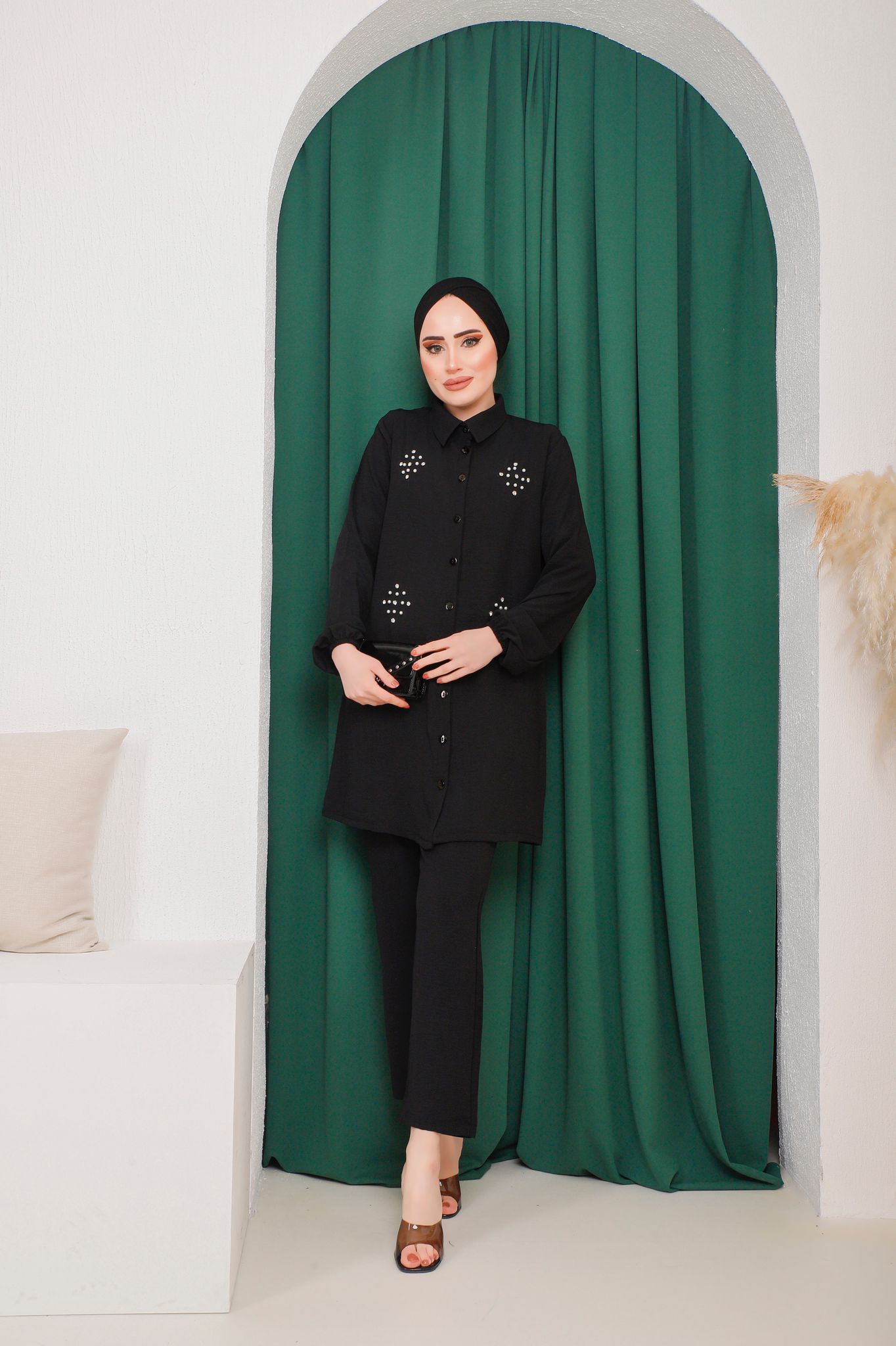 TUNIK SIFIR YAKA KOL UCU LASTIKLI ETEK UCU DÜZ KOLLAR INCI DETAYLI KENDI KUMAŞINDAN KUŞAKLI