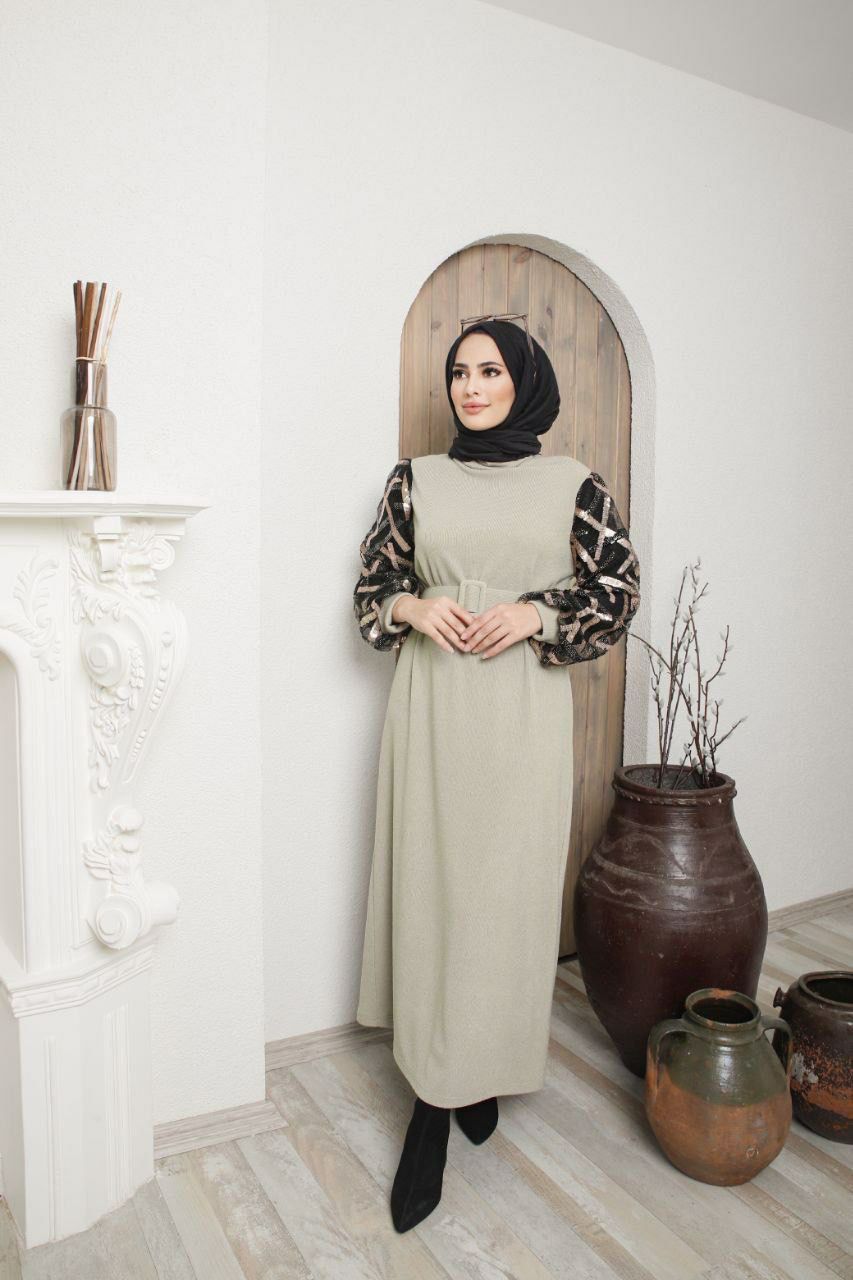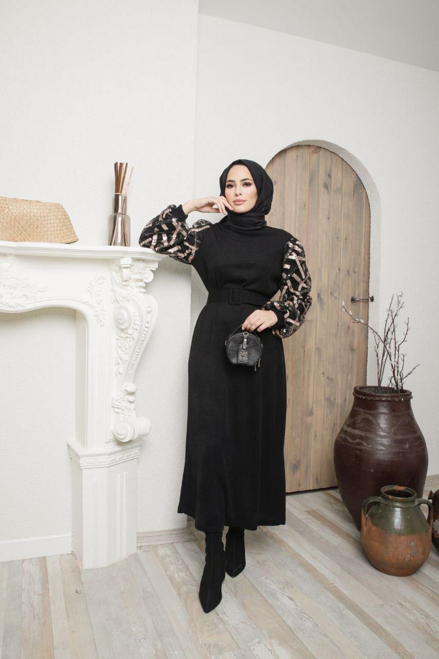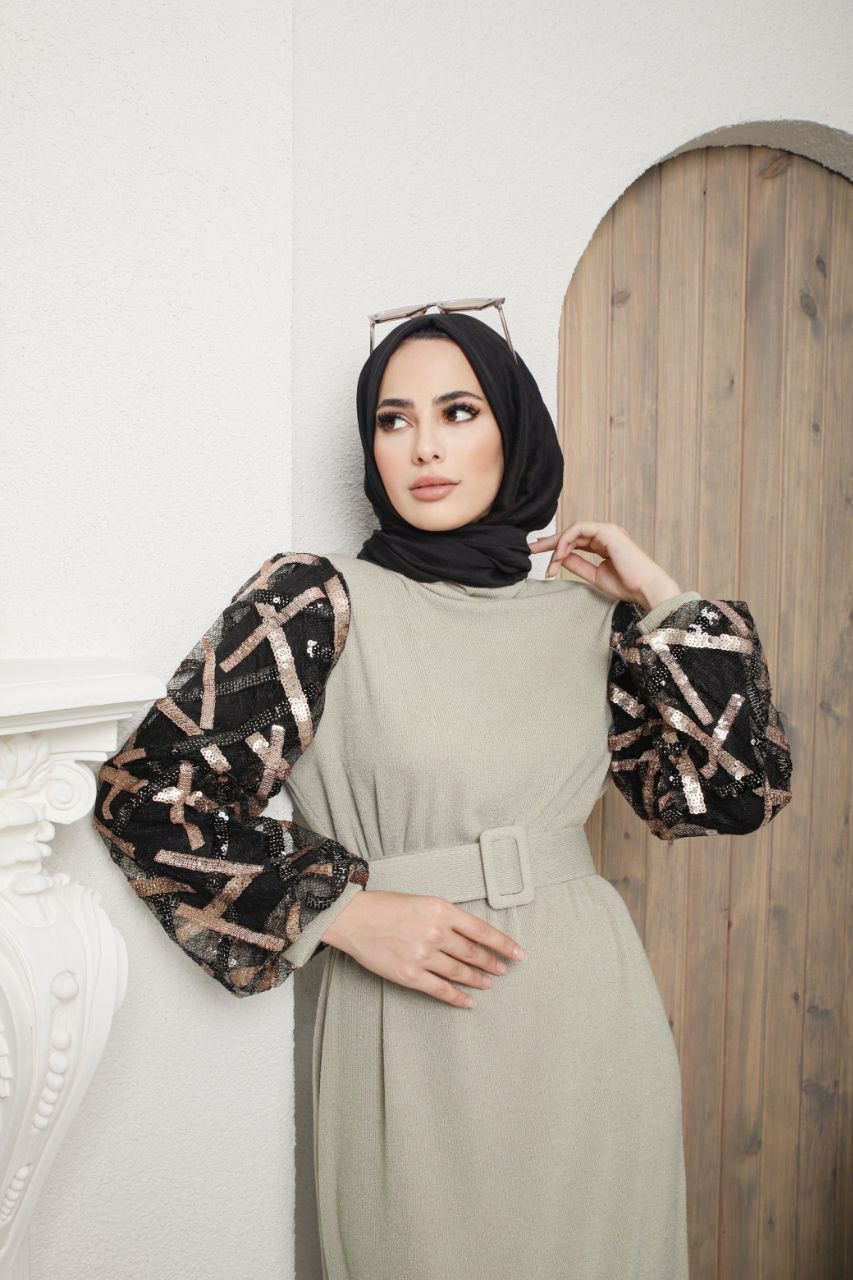 Ürün içeriği triko kollarında payet dül süslemesi ile kaplama kemer hediyeli