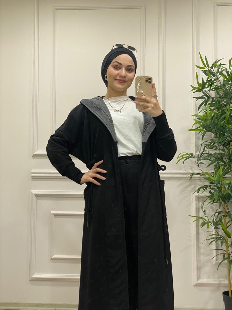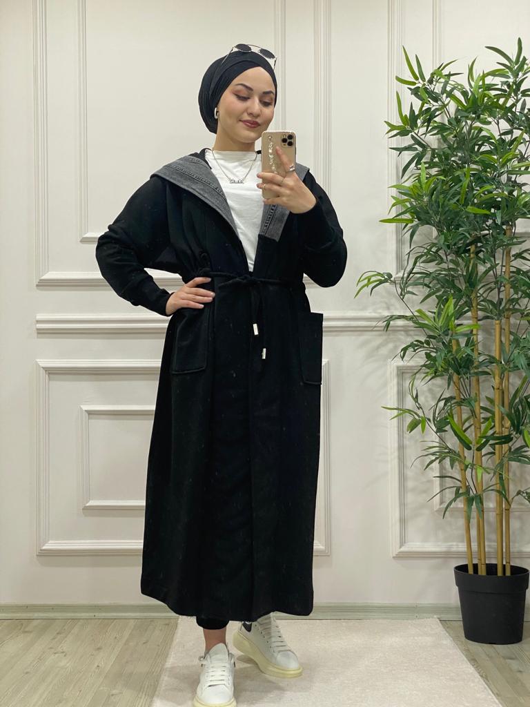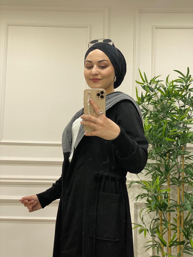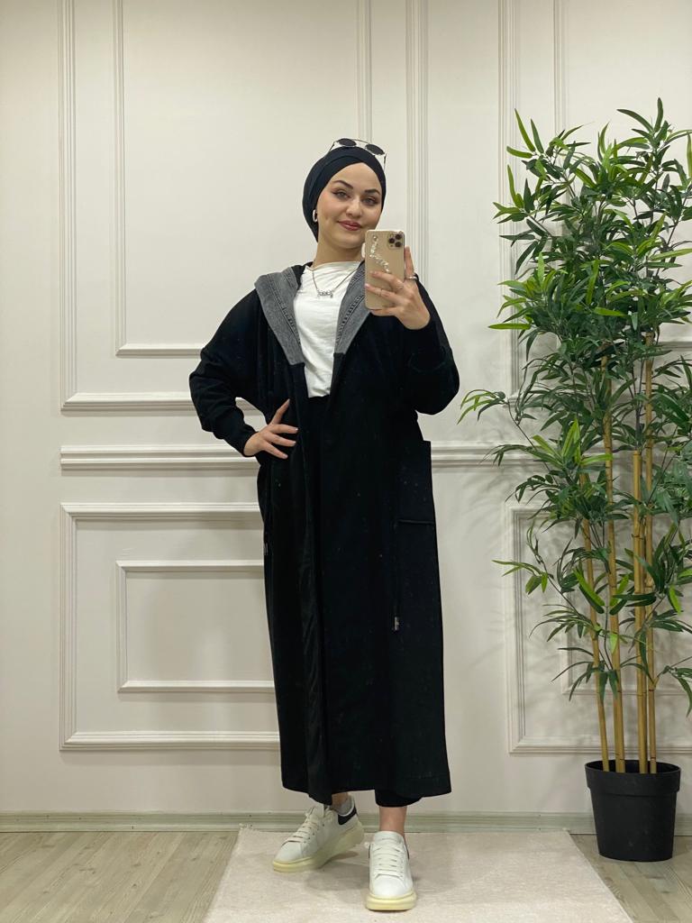 Kot detaylı üç iplik kumaş kap - Saklı tesettür kadın giyim elbise etek tunik takım