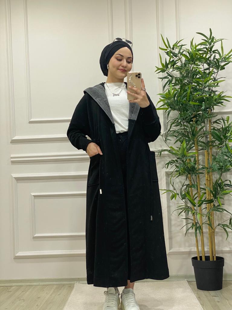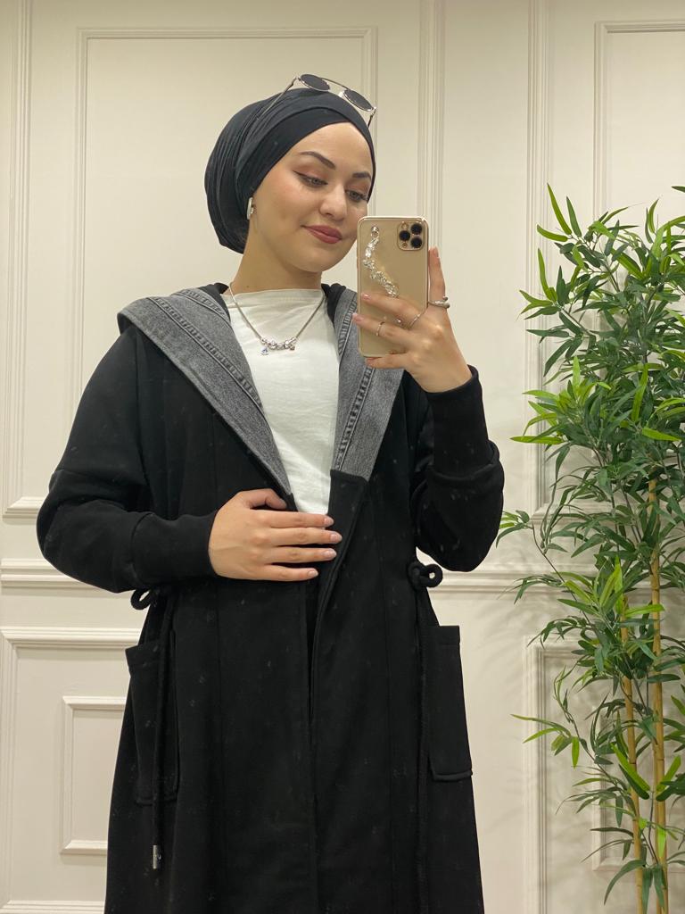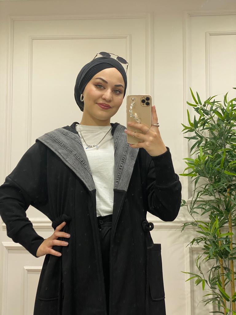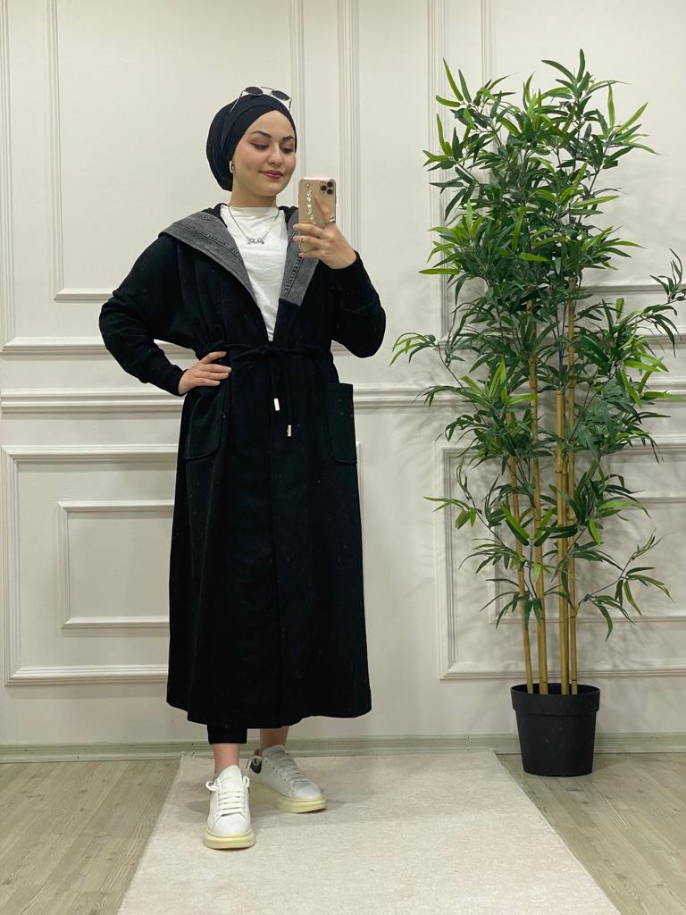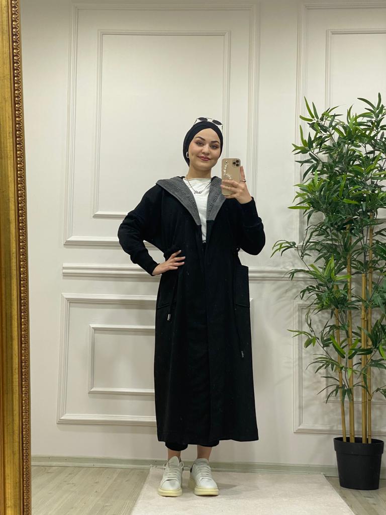 Kot detaylı üç iplik kumaş kap - Saklı tesettür kadın giyim elbise etek tunik takım
