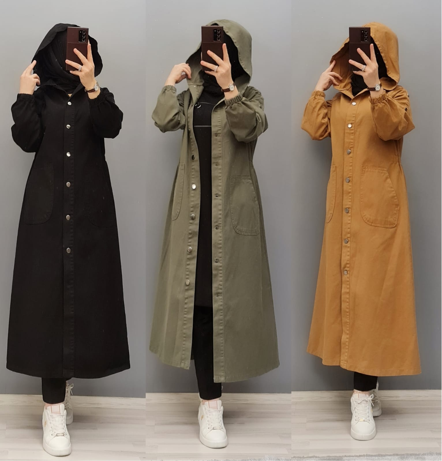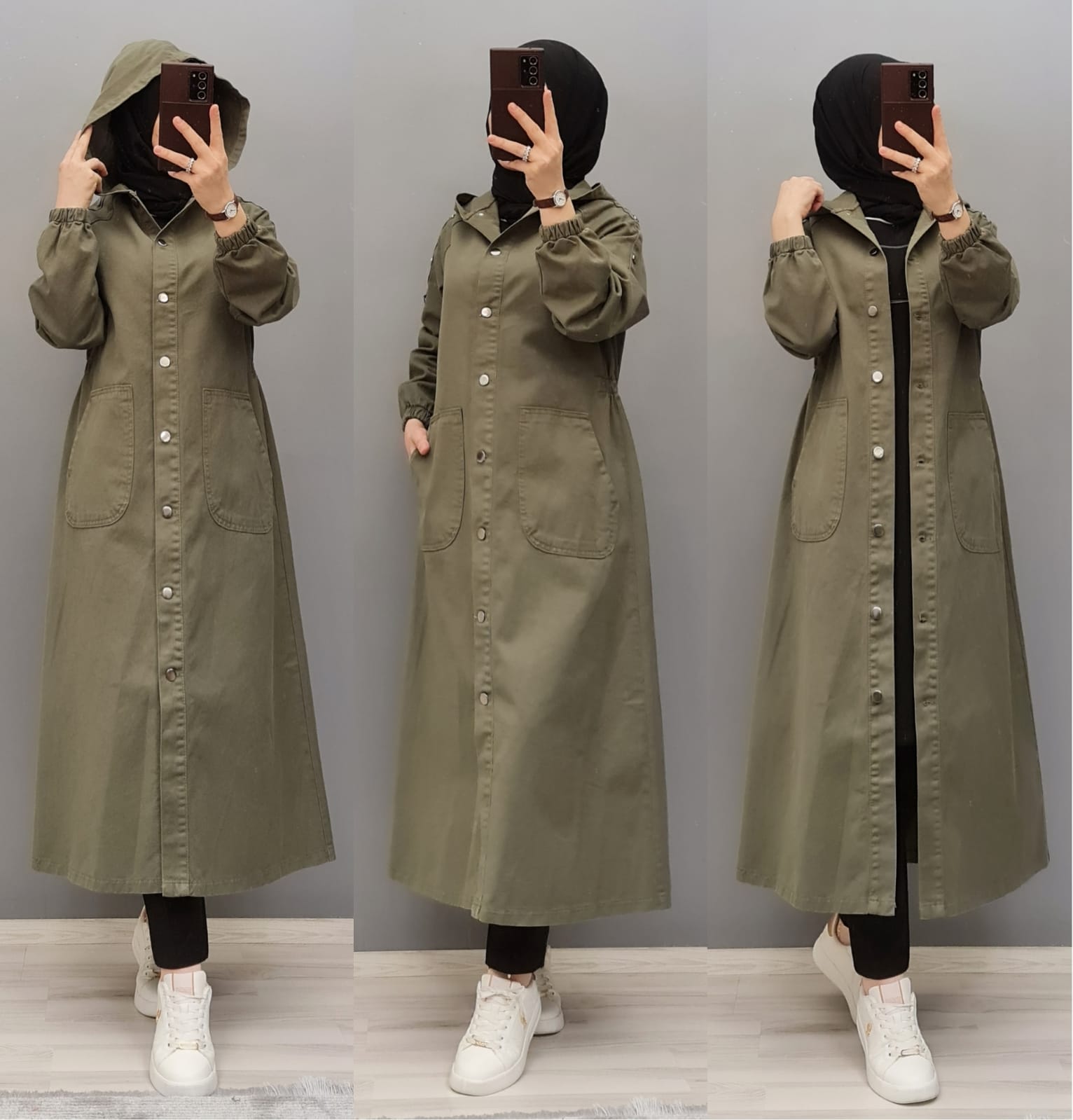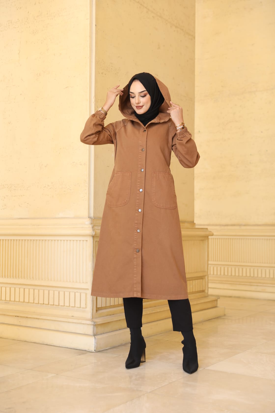 👗Trençkot kapüşonludur. Kol kısımları düğme detaylıdır.