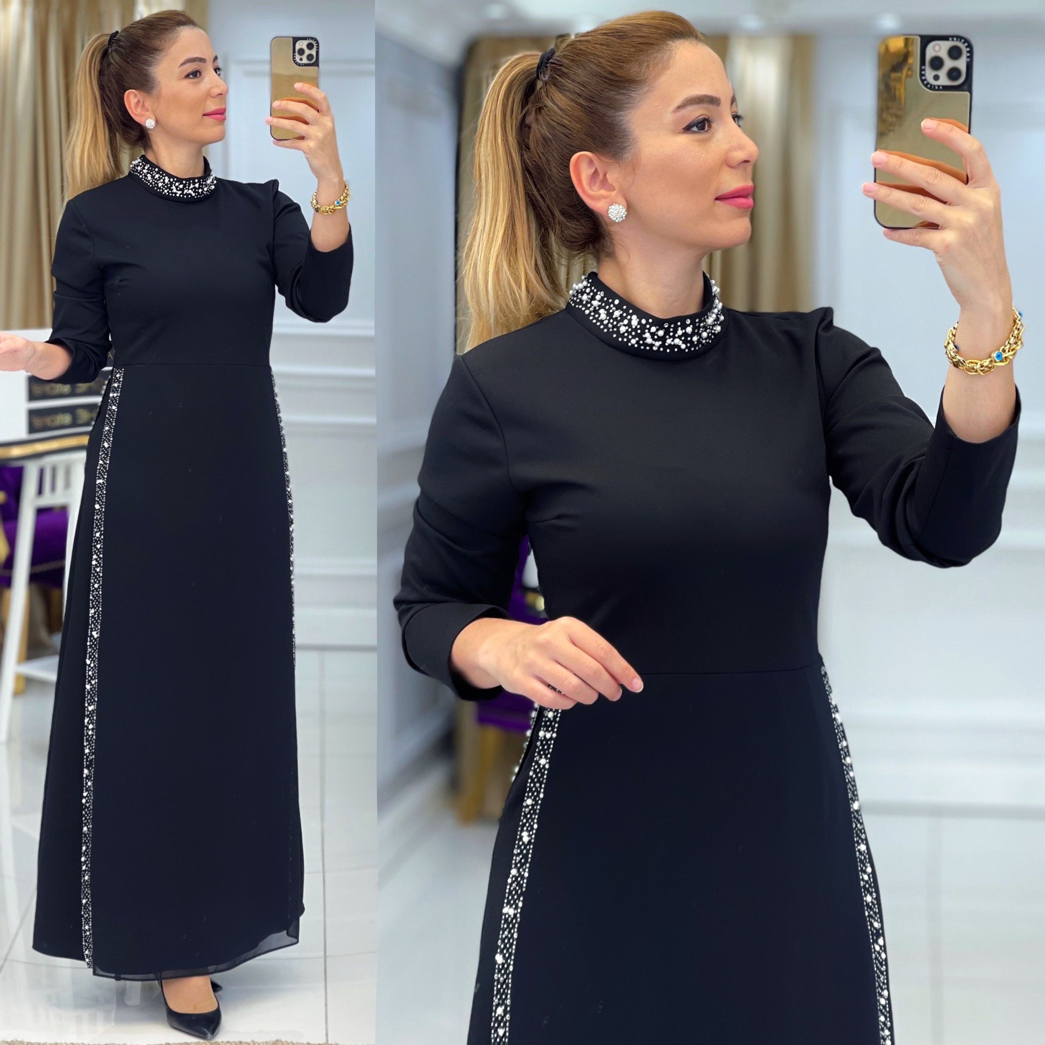 Ürün bilgileri: Birinci Sınıf Scuba Krep kumaştır. Piliseli kısım şifon kumaştır. Seyyar Kemerli, Yan kısımdan fermuarlıdır. Çakma inci detaylıdır.