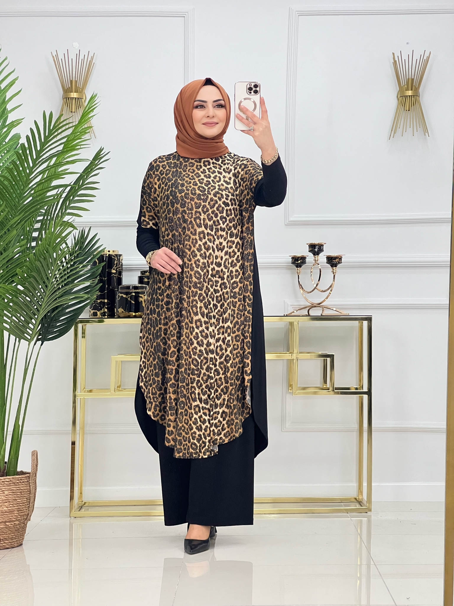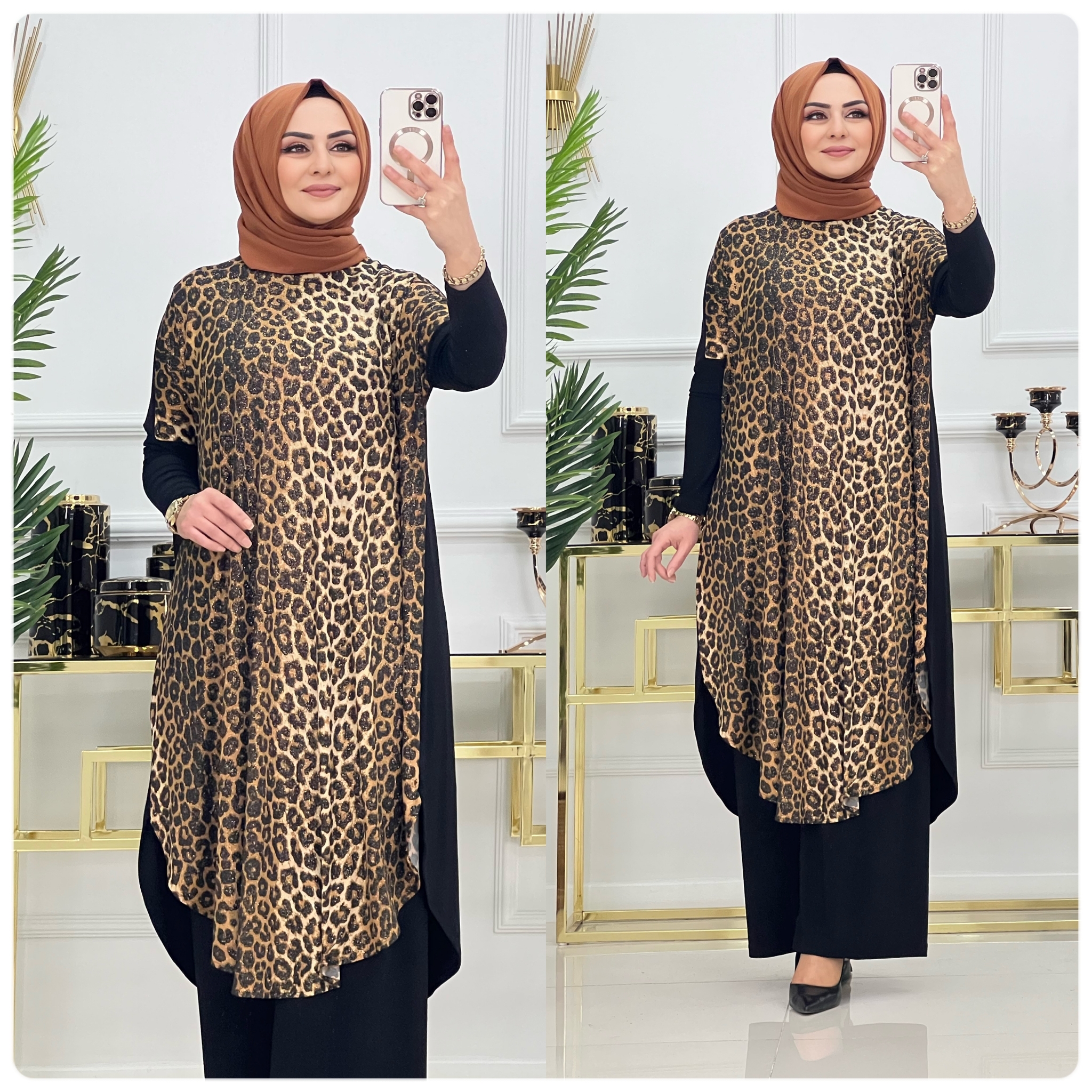 Leopar tunik takım sandy kumaş - Saklı tesettür kadın giyim elbise etek tunik takım