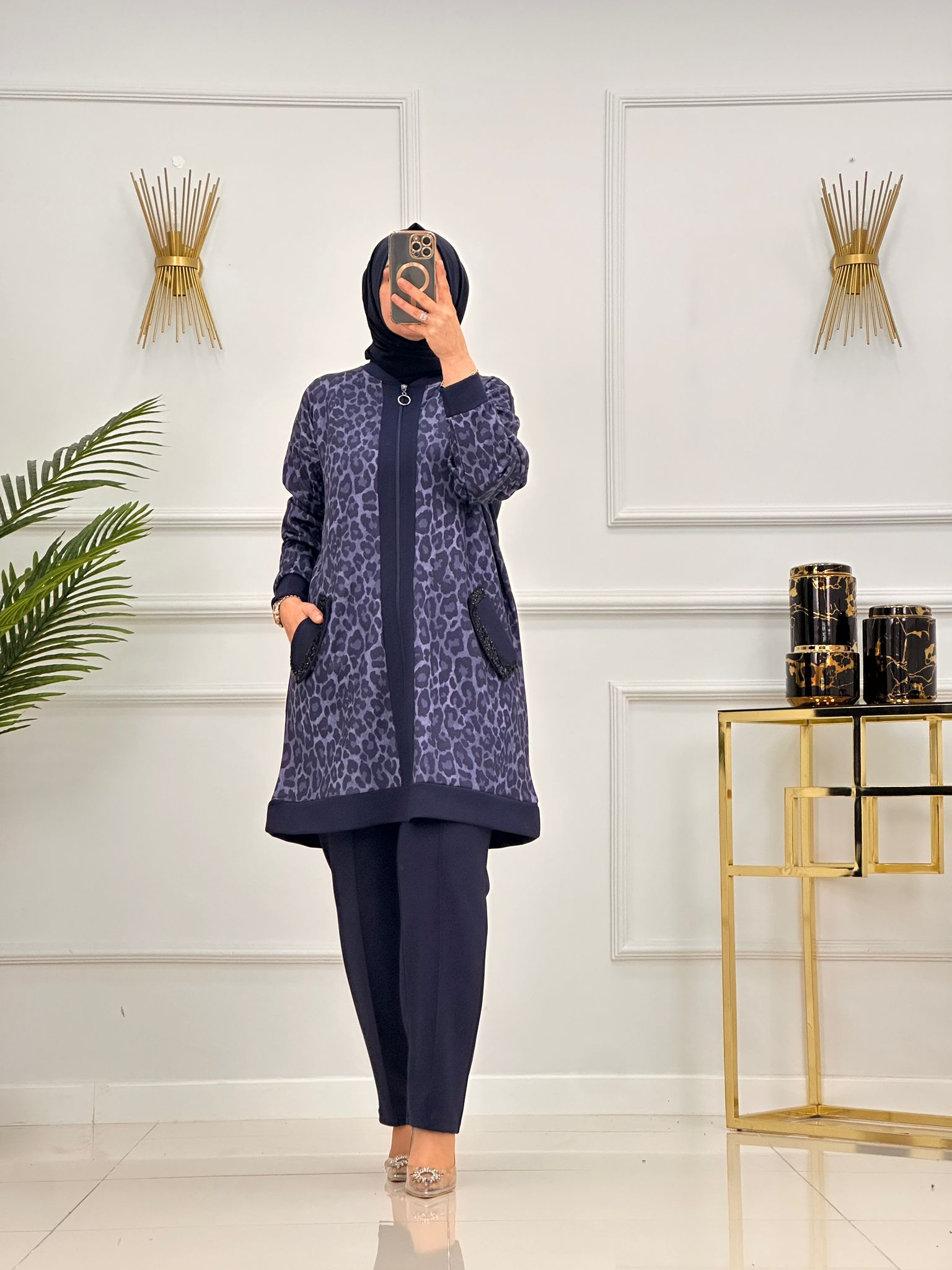 Dijital leopar desen baskı hırka ve çimalı pantolon olarak iki parçadır