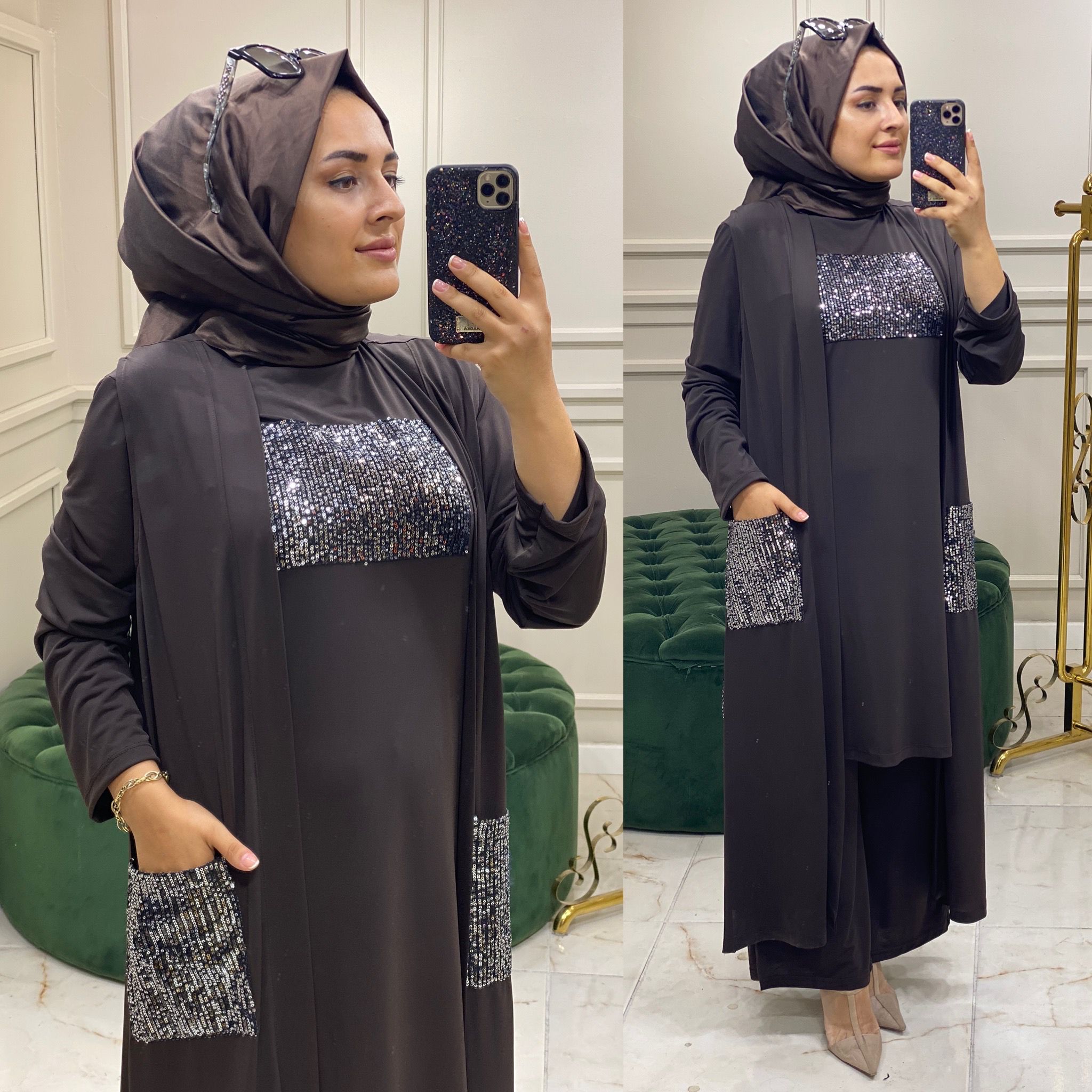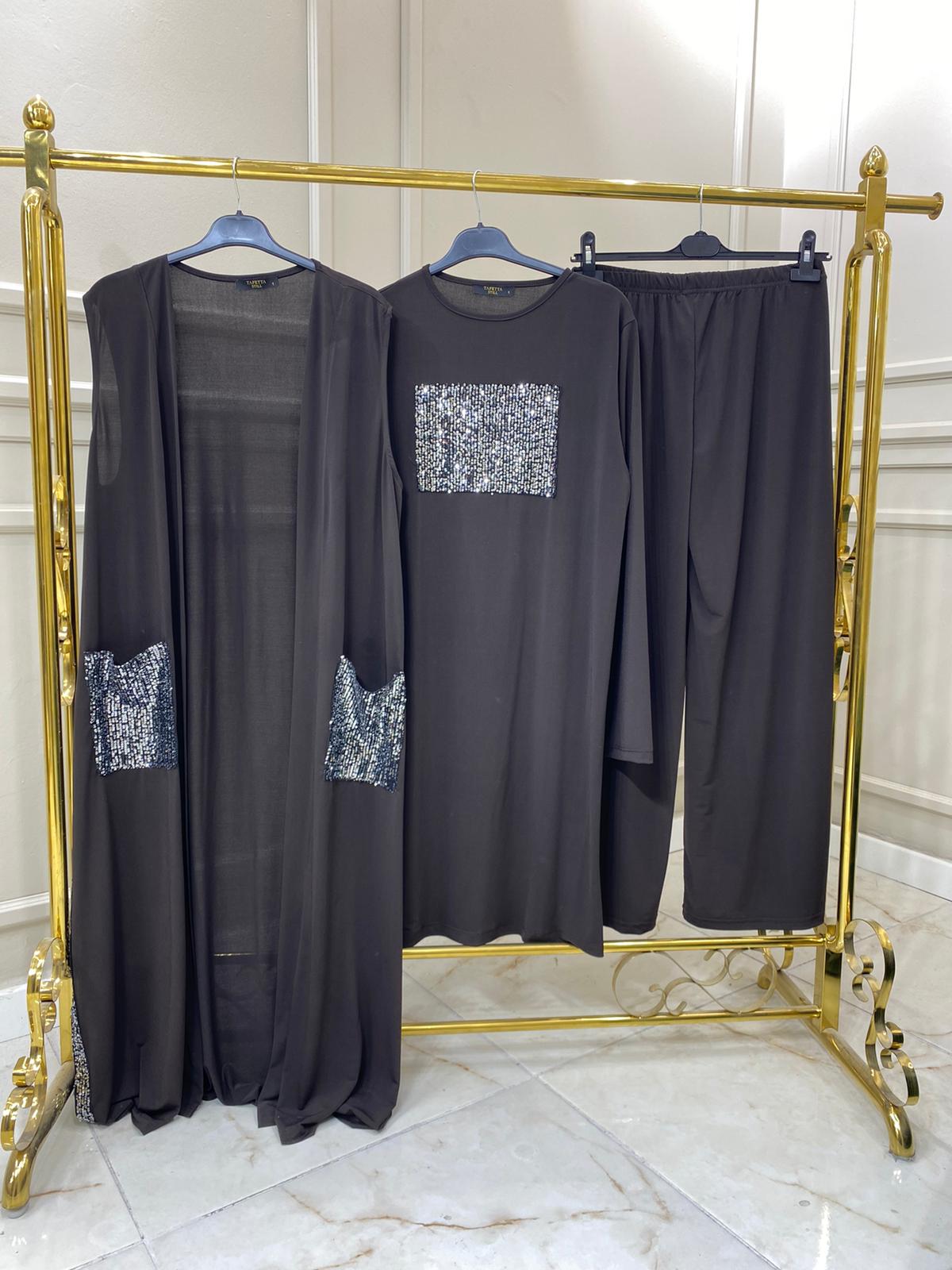 Palet detaylı üçlü yelek takım - Saklı tesettür kadın giyim elbise etek tunik takım