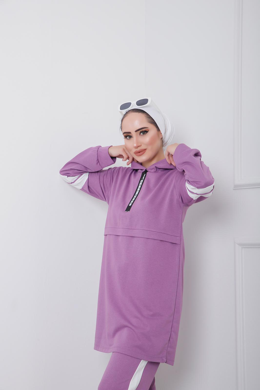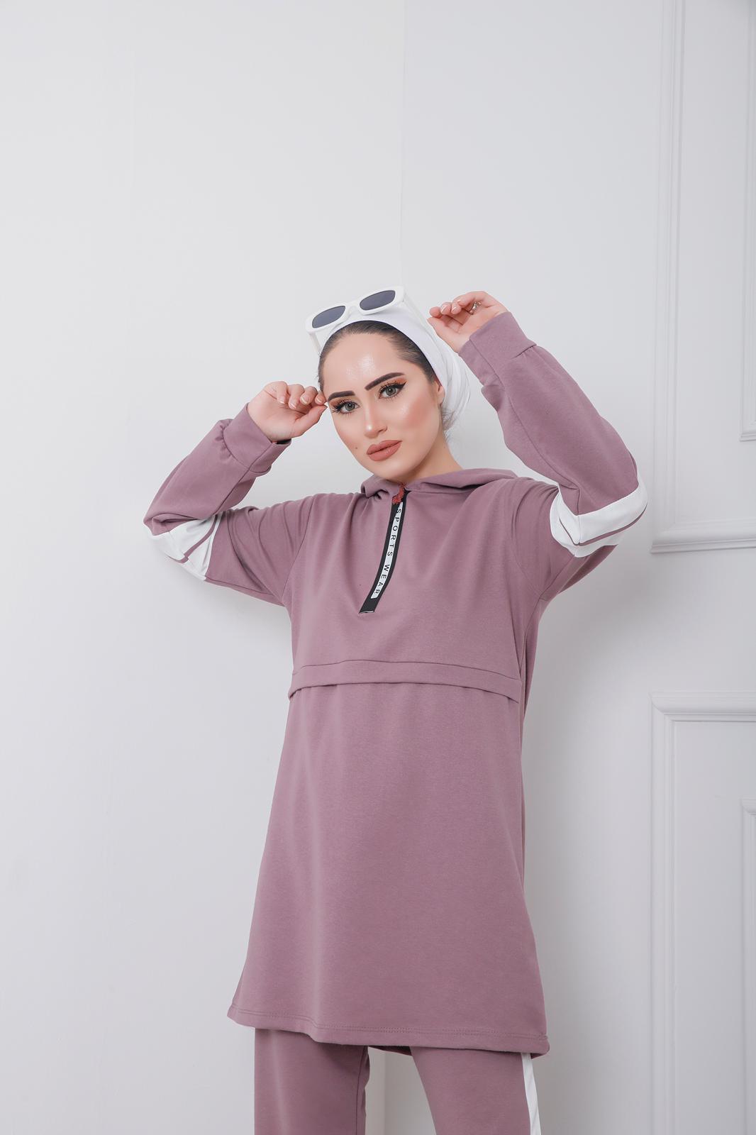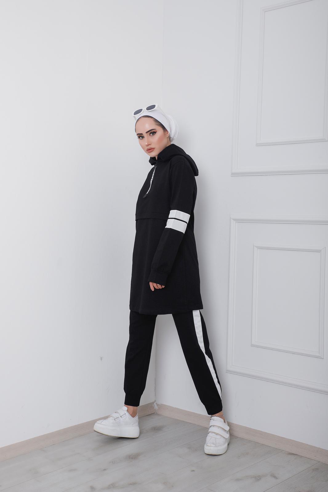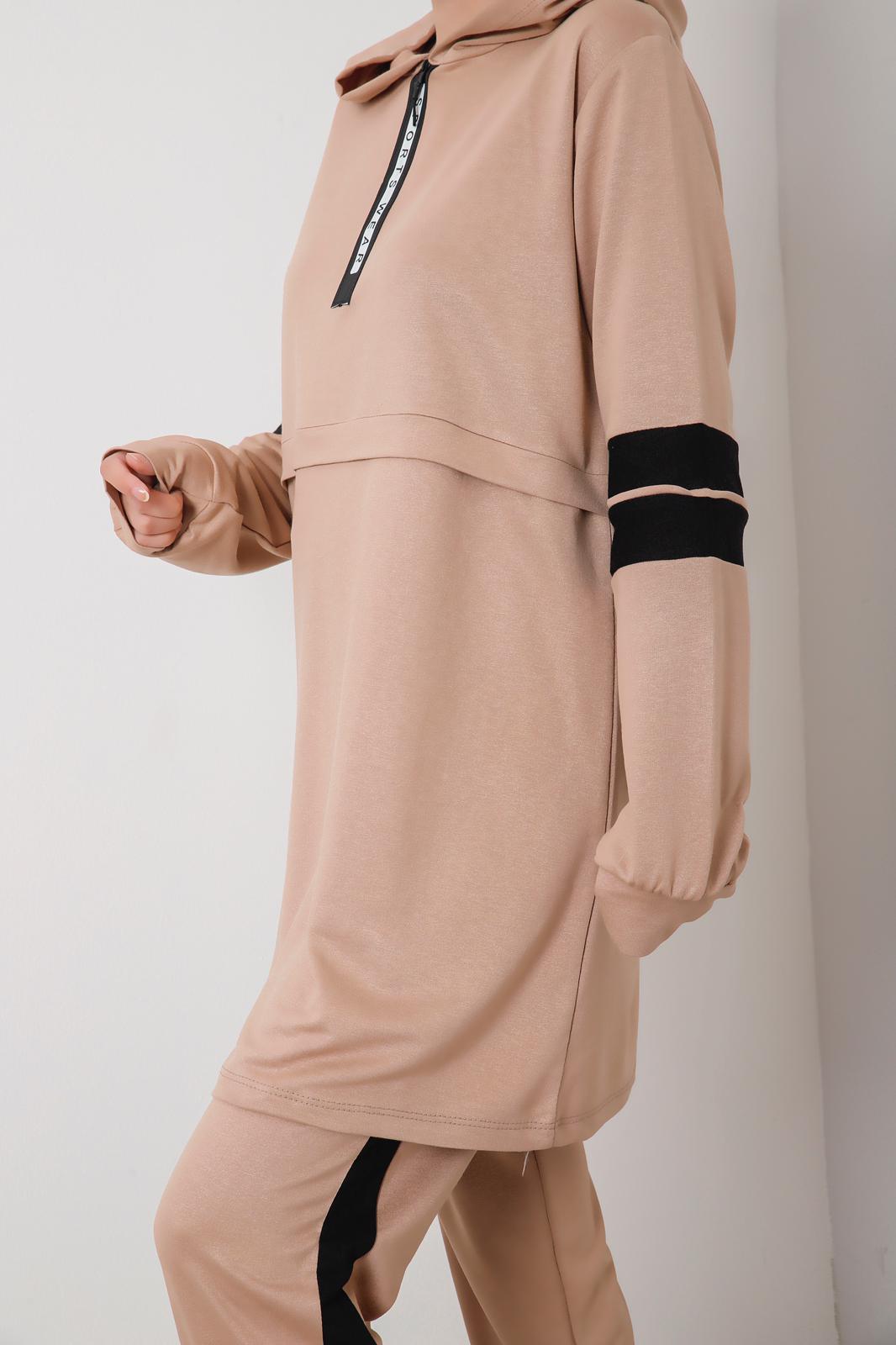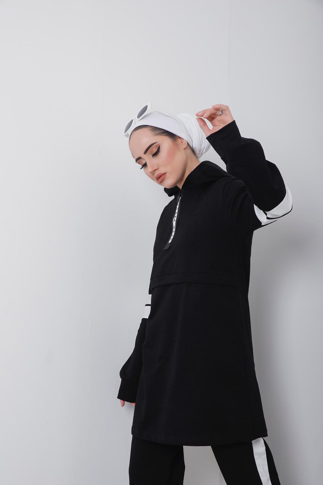 Kapşon yaka kol ucu ribanalı tunik ucu düz yarım pat fermauarlı detaylı