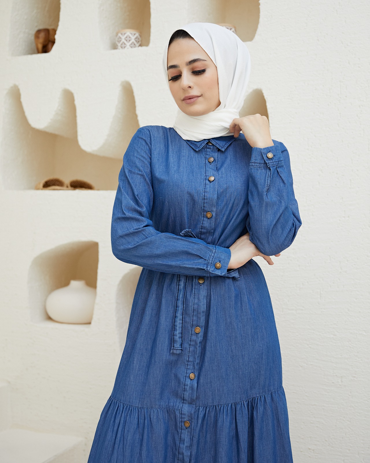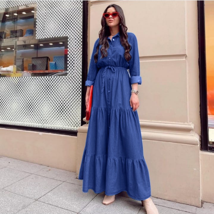 Tam Boy Düğmeli Tensel Kot Elbise.