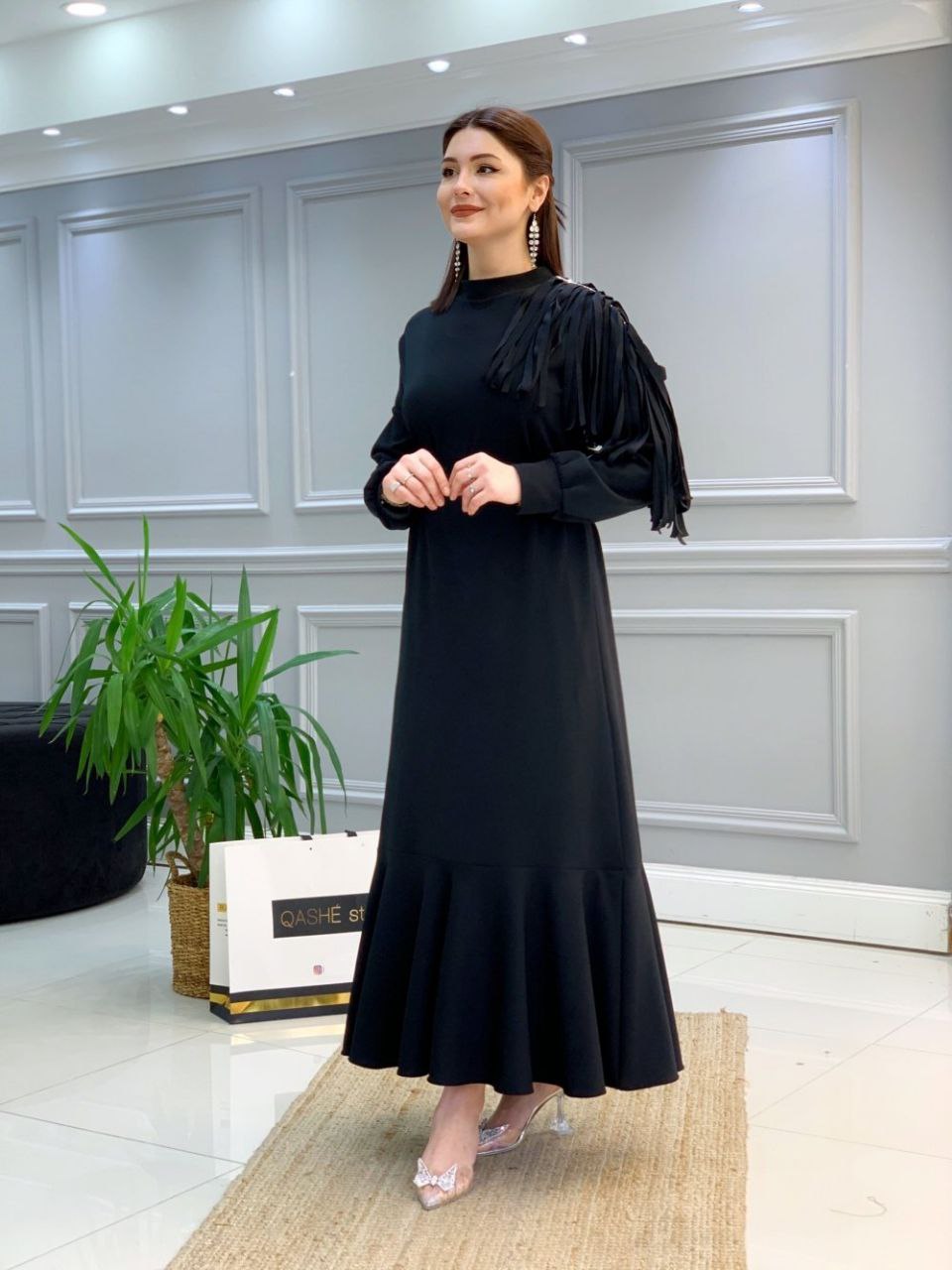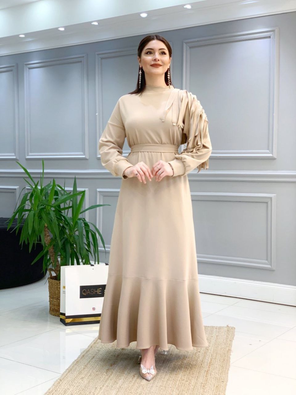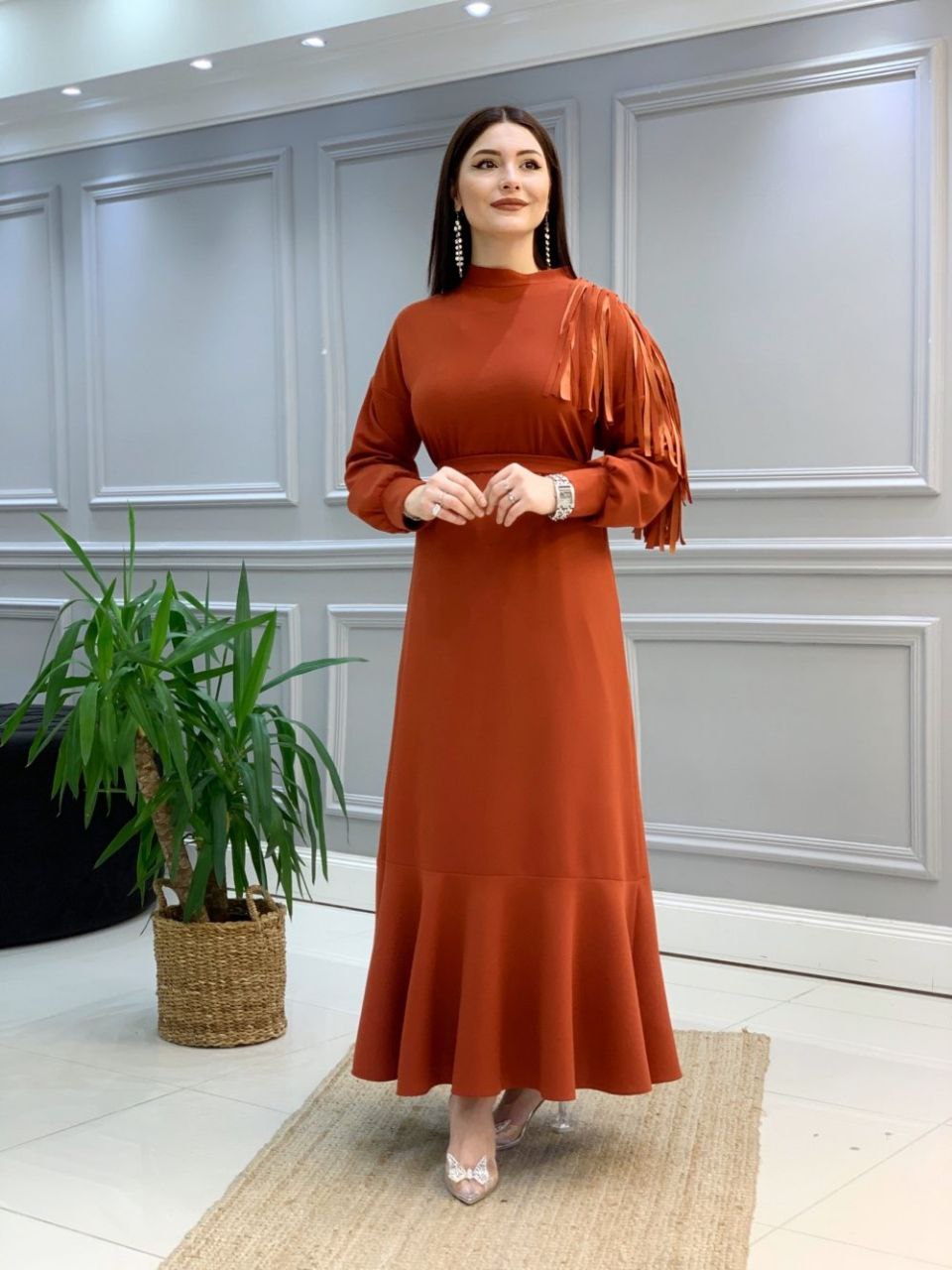 4 beden: 44-46 bedene uyumludur. 1.sınıf scuba kumaştır. Sağ omzunda taş işlemesi ve saçak detayı mevcuttur. Ürün boyu: 140 cm dir. 1 beden ölçüleri Göğüs: 100 cm,bel:98 cm,basen: 108 cm dir.
