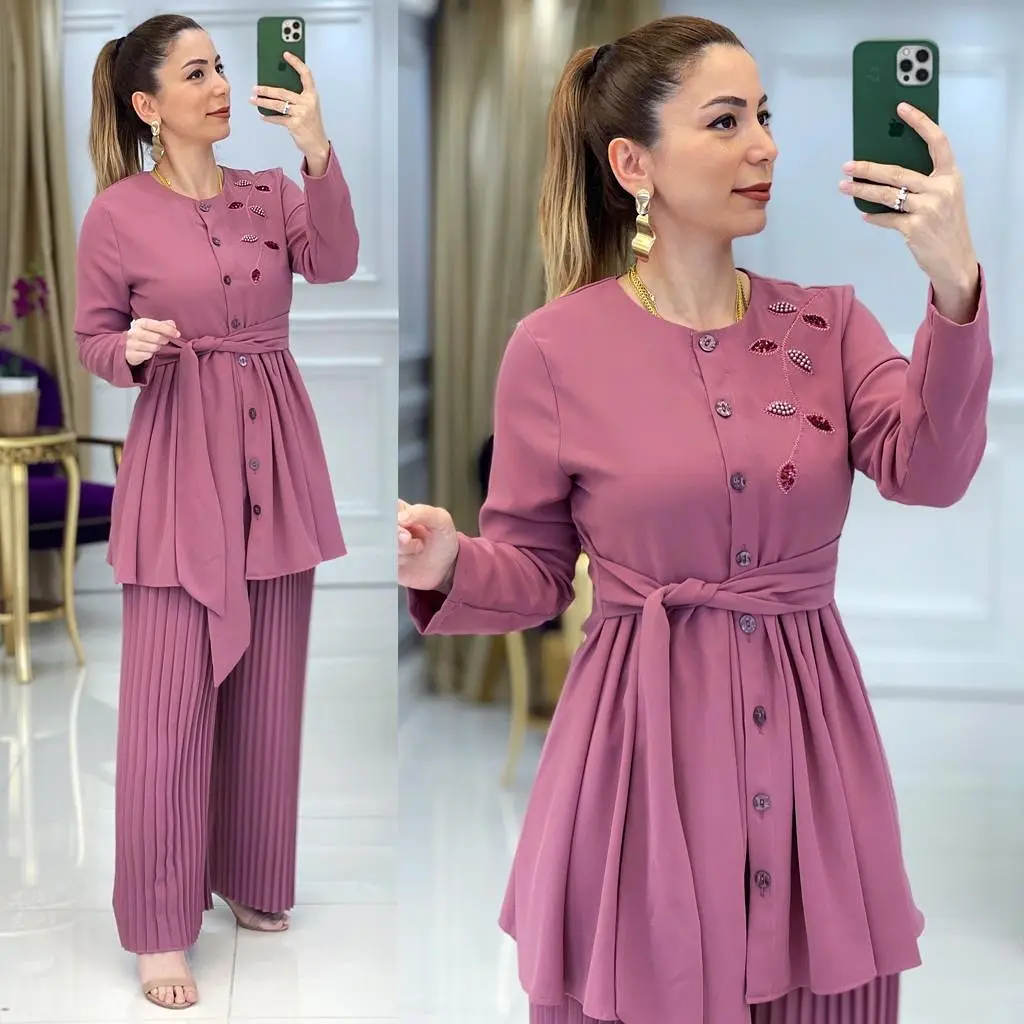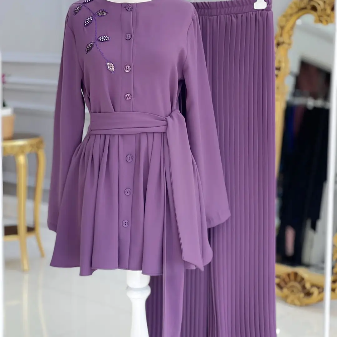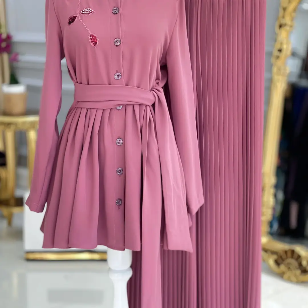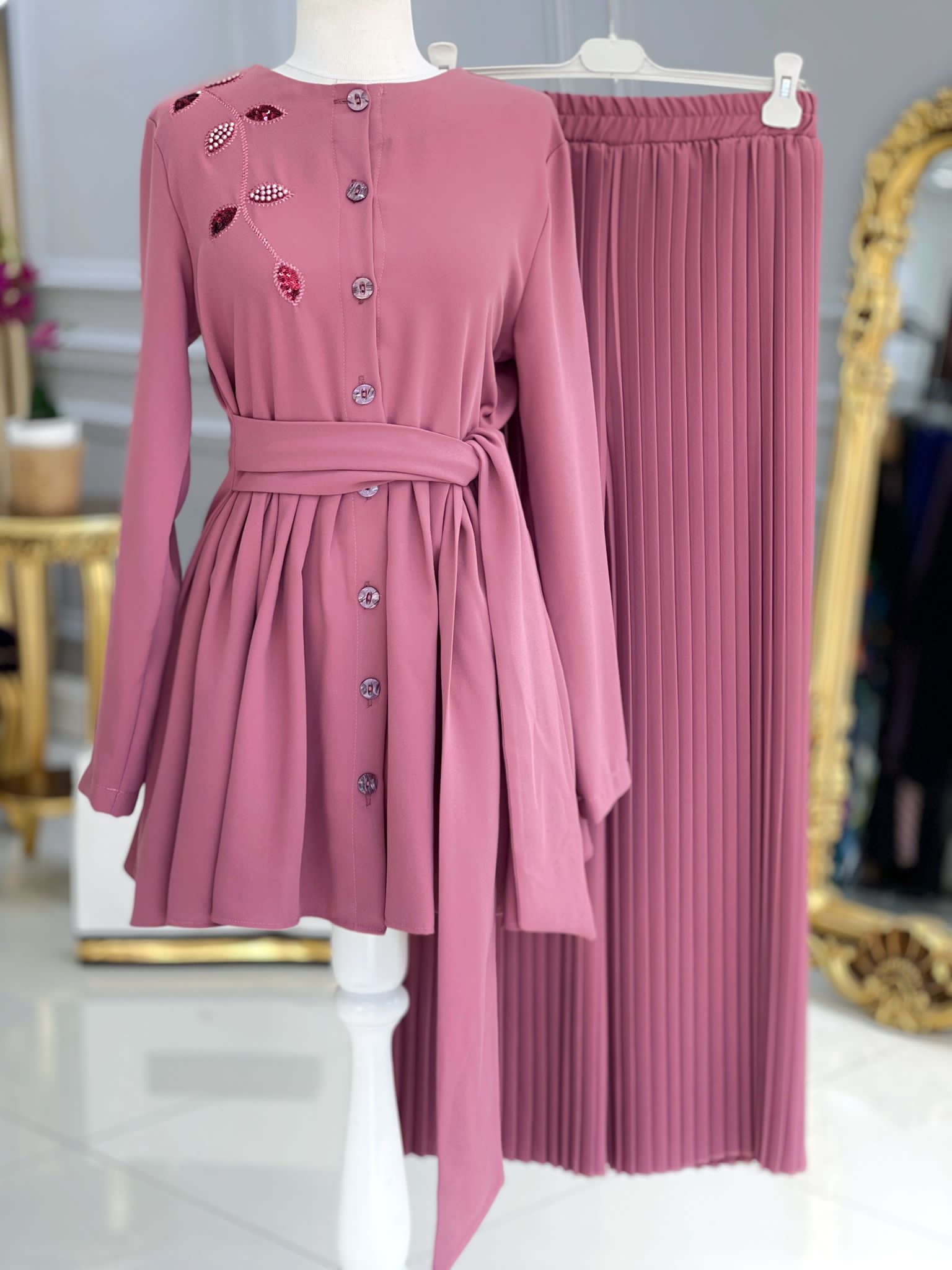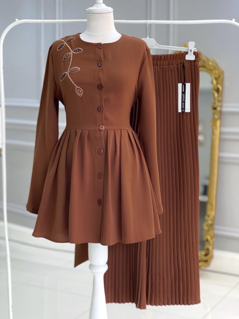 Taş işlemi krep kumaş tunik takım - Saklı tesettür kadın giyim elbise etek tunik takım