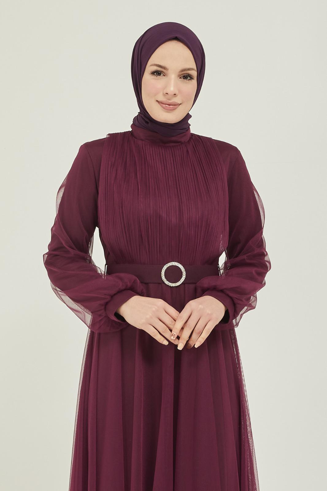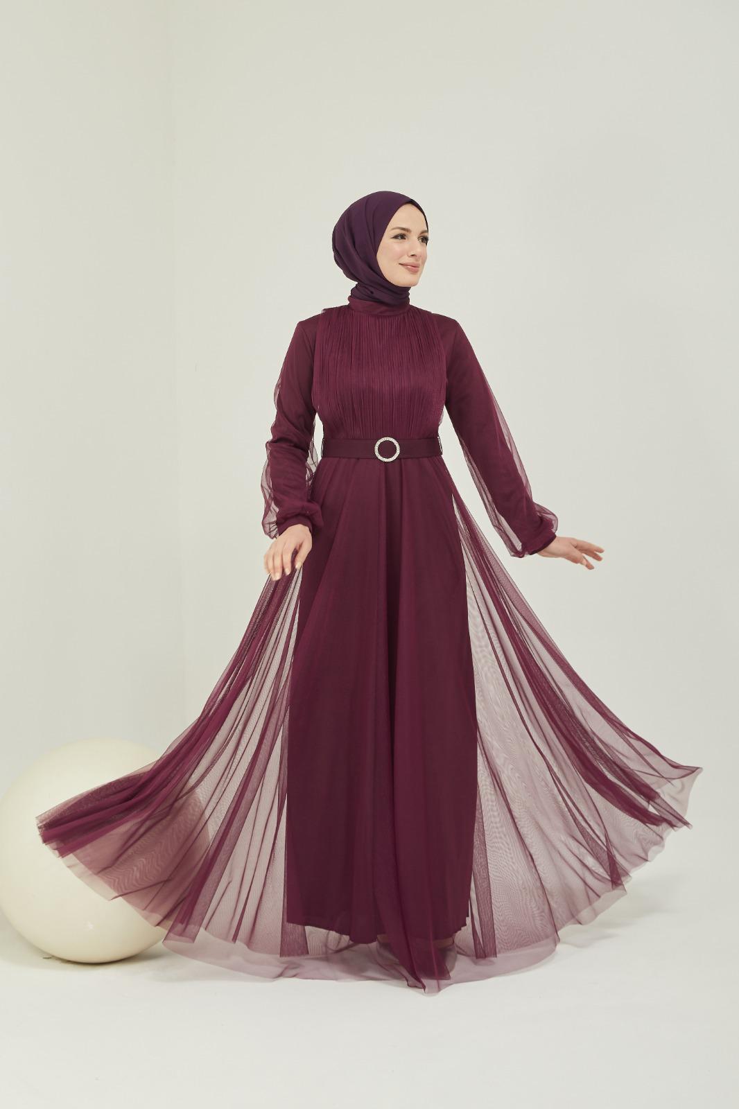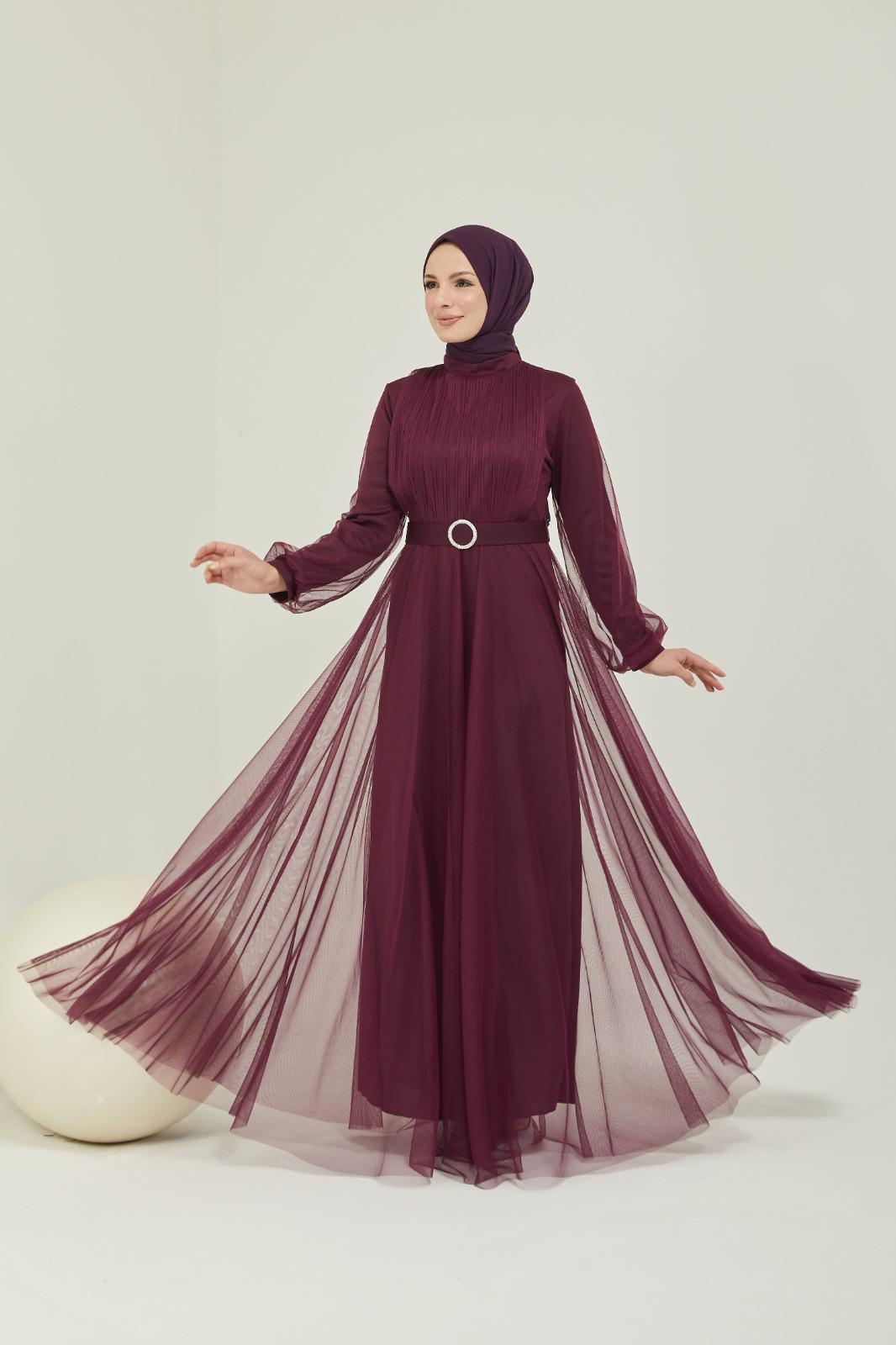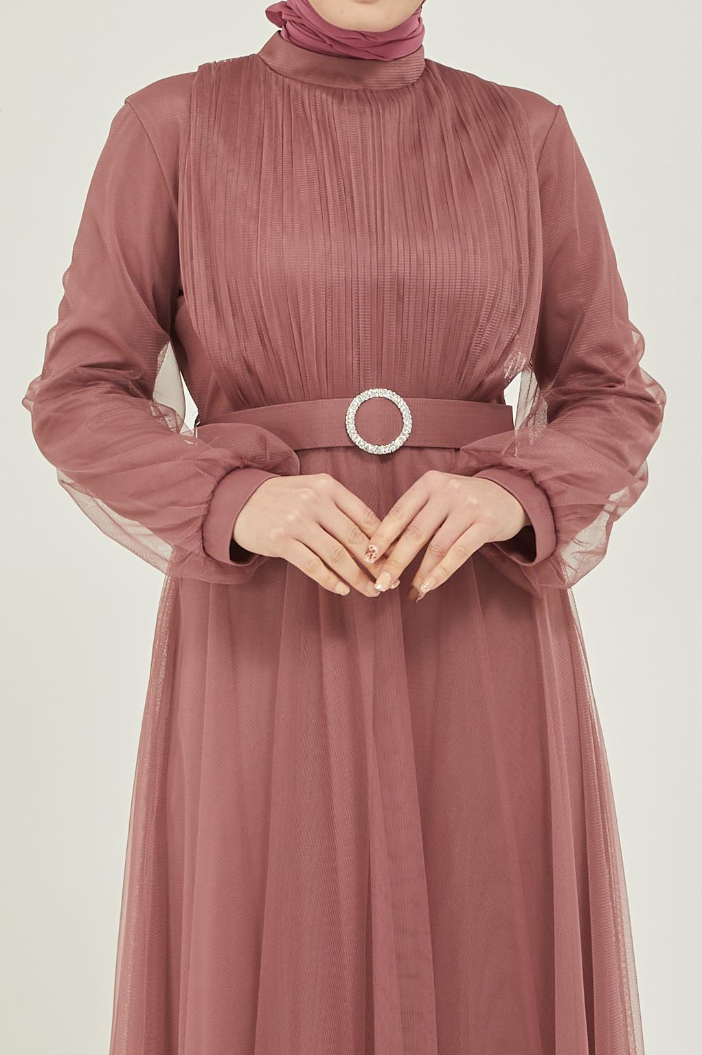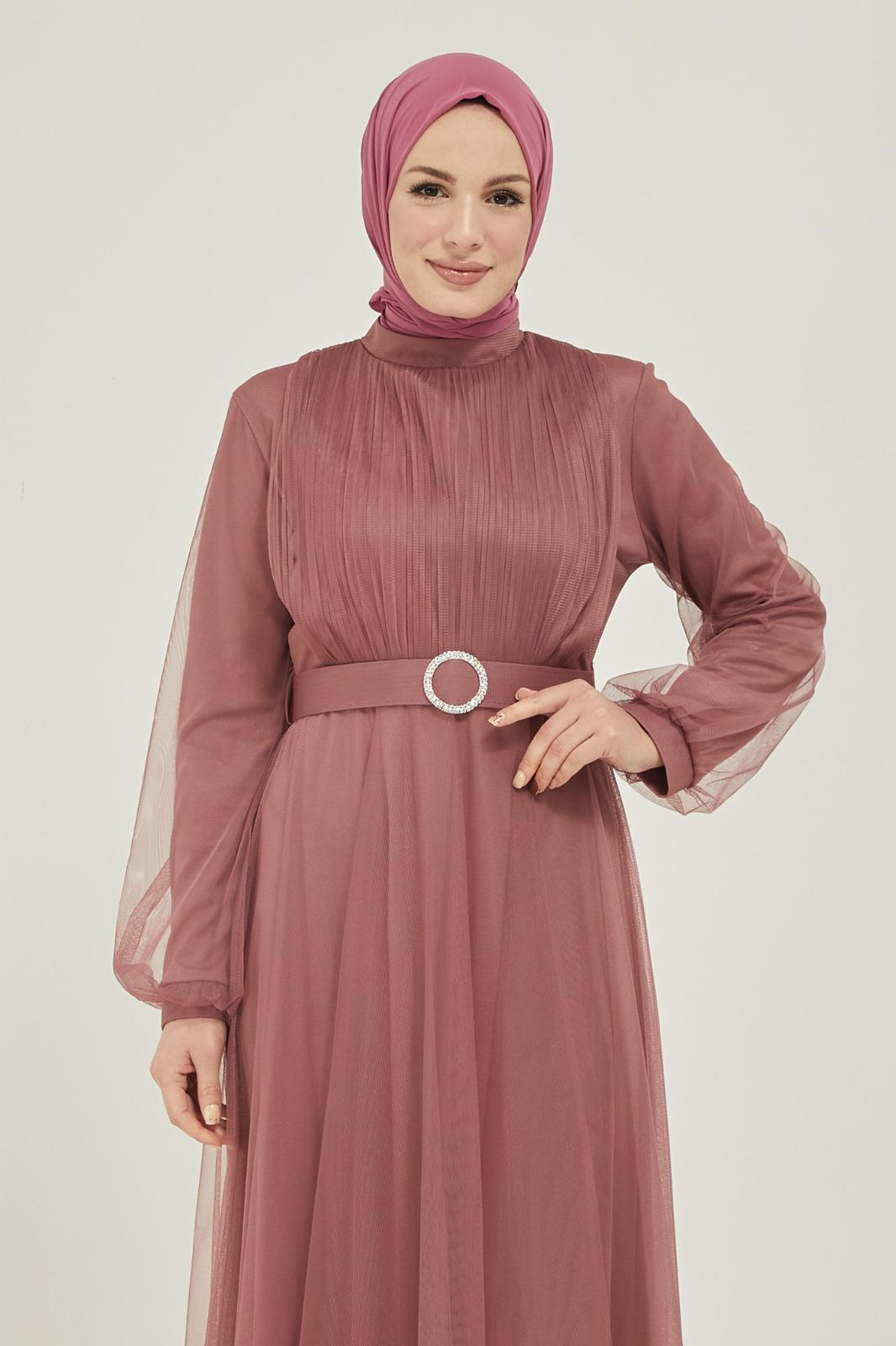 Tüllü kemerli taş aksesuarlı abiye - Saklı tesettür kadın giyim elbise etek tunik takım