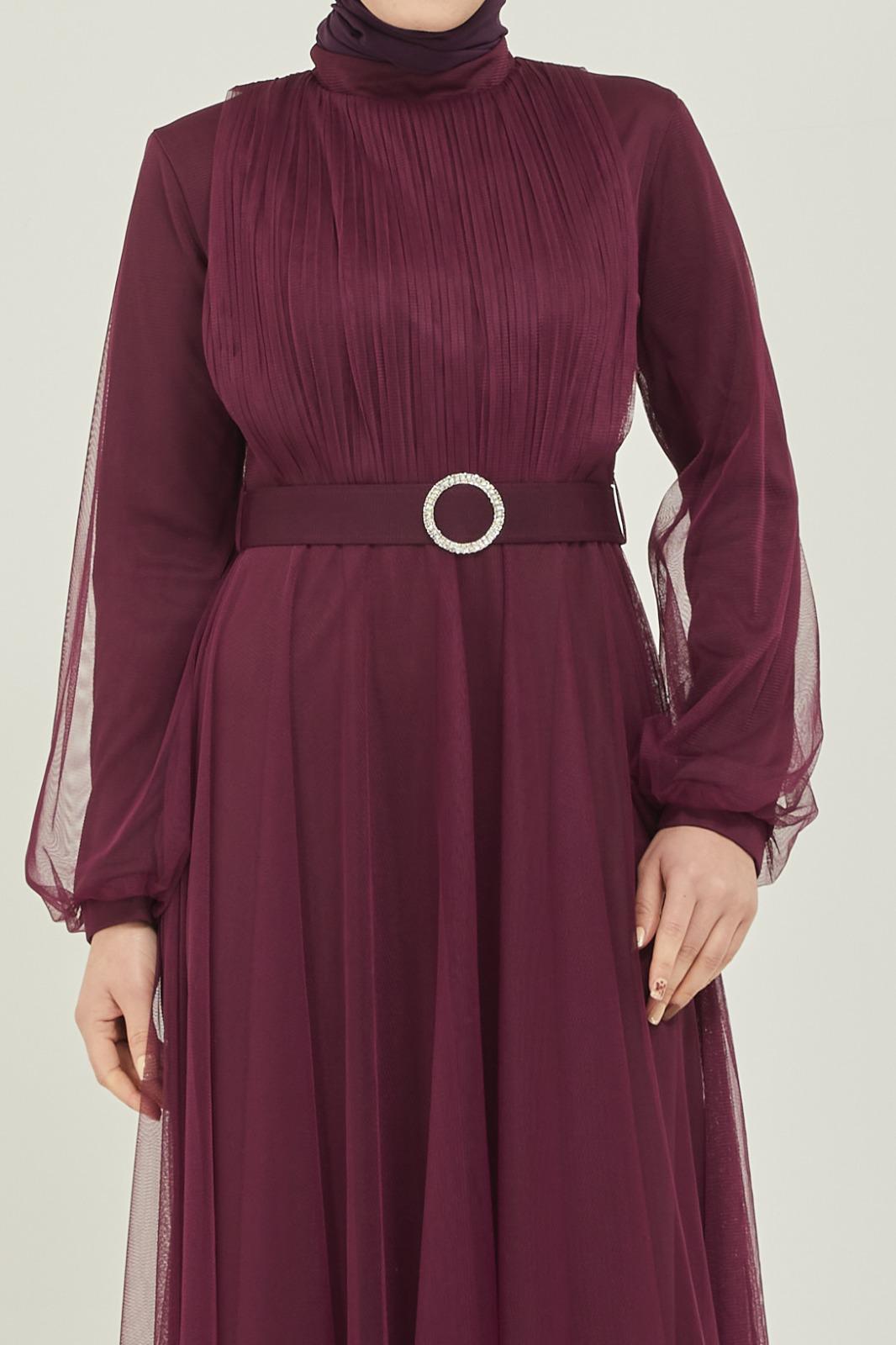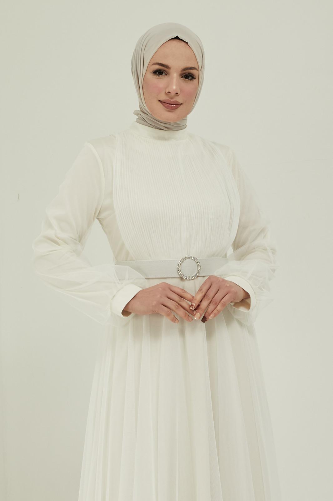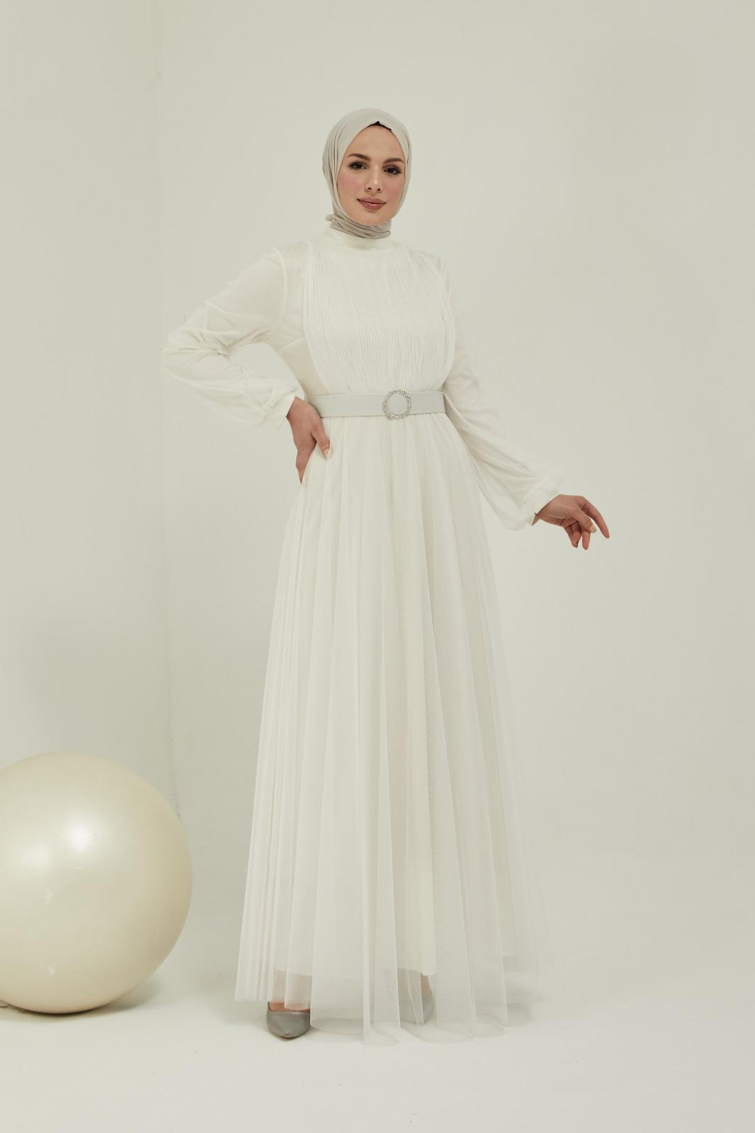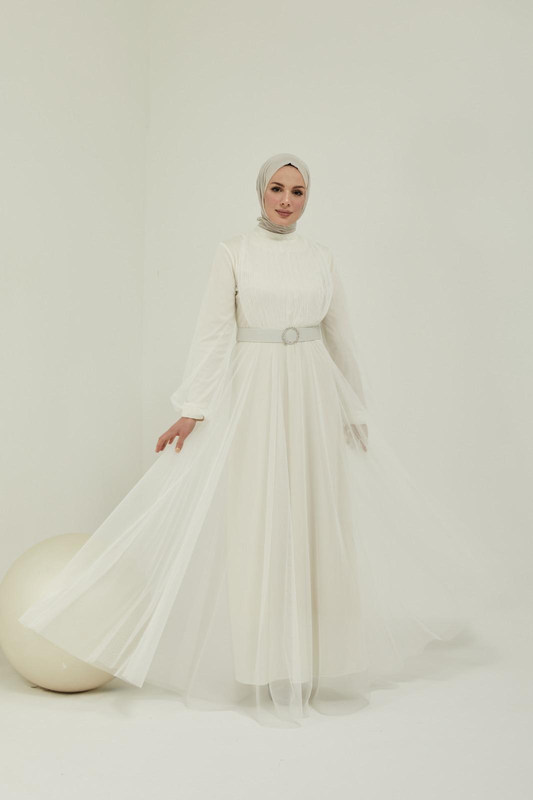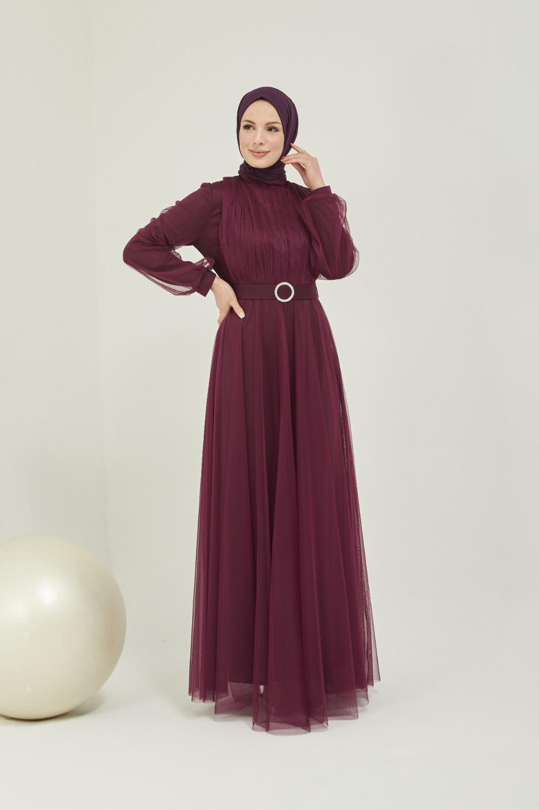 Tüllü kemerli taş aksesuarlı abiye - Saklı tesettür kadın giyim elbise etek tunik takım