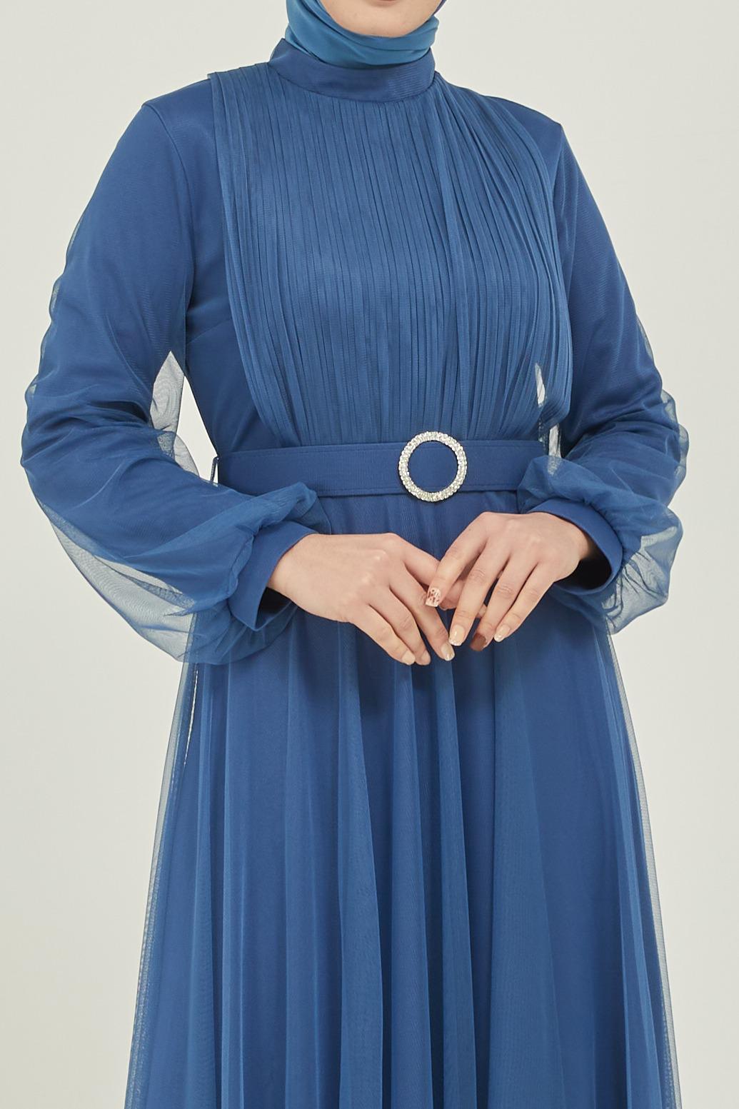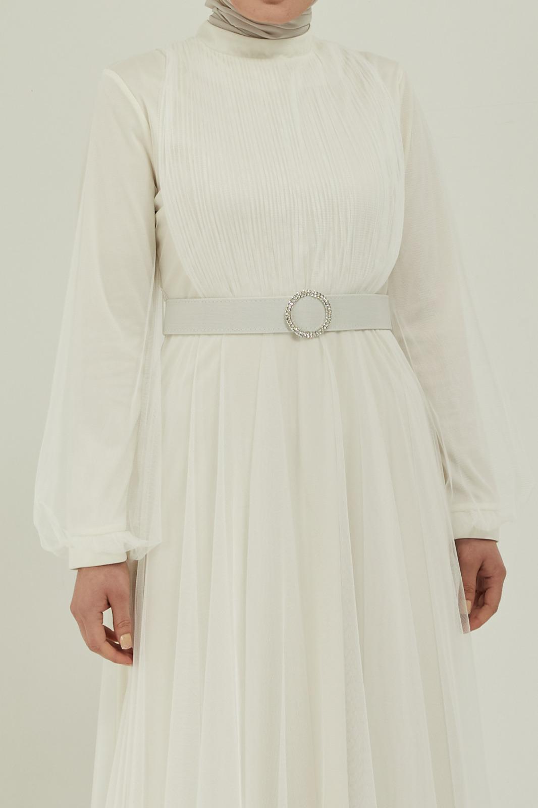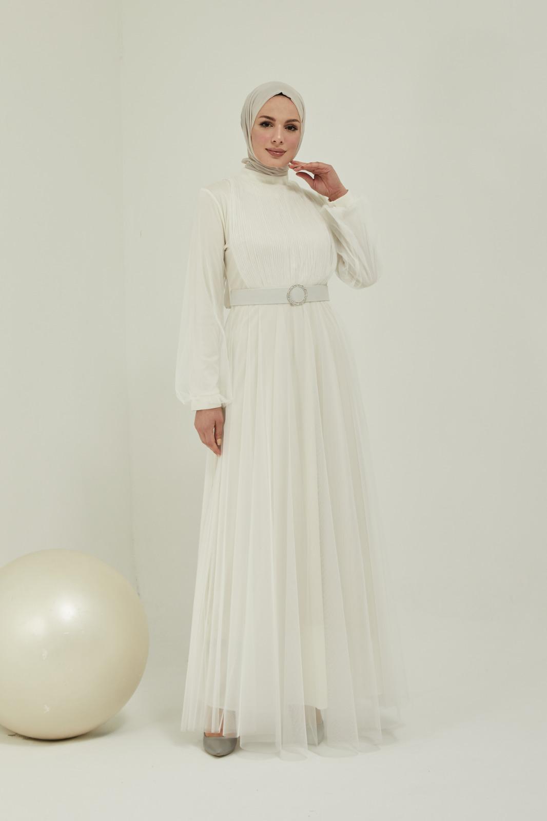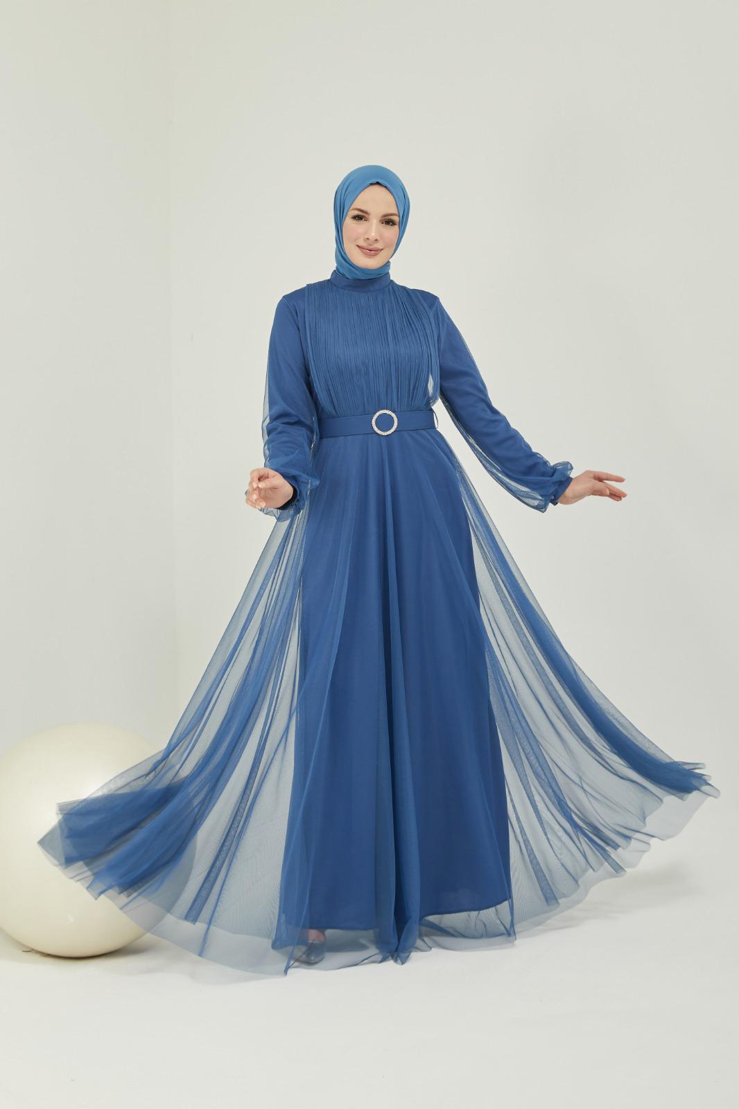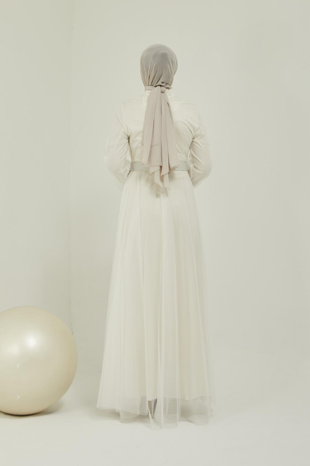 Tüllü kemerli taş aksesuarlı abiye - Saklı tesettür kadın giyim elbise etek tunik takım