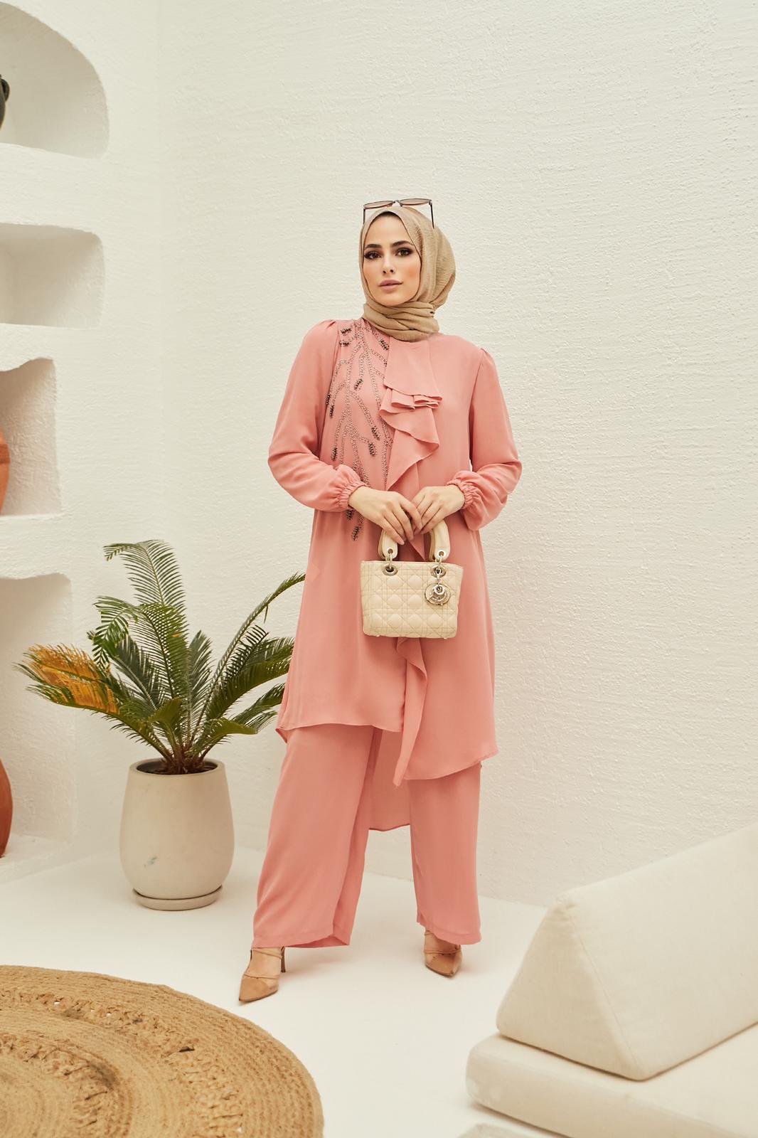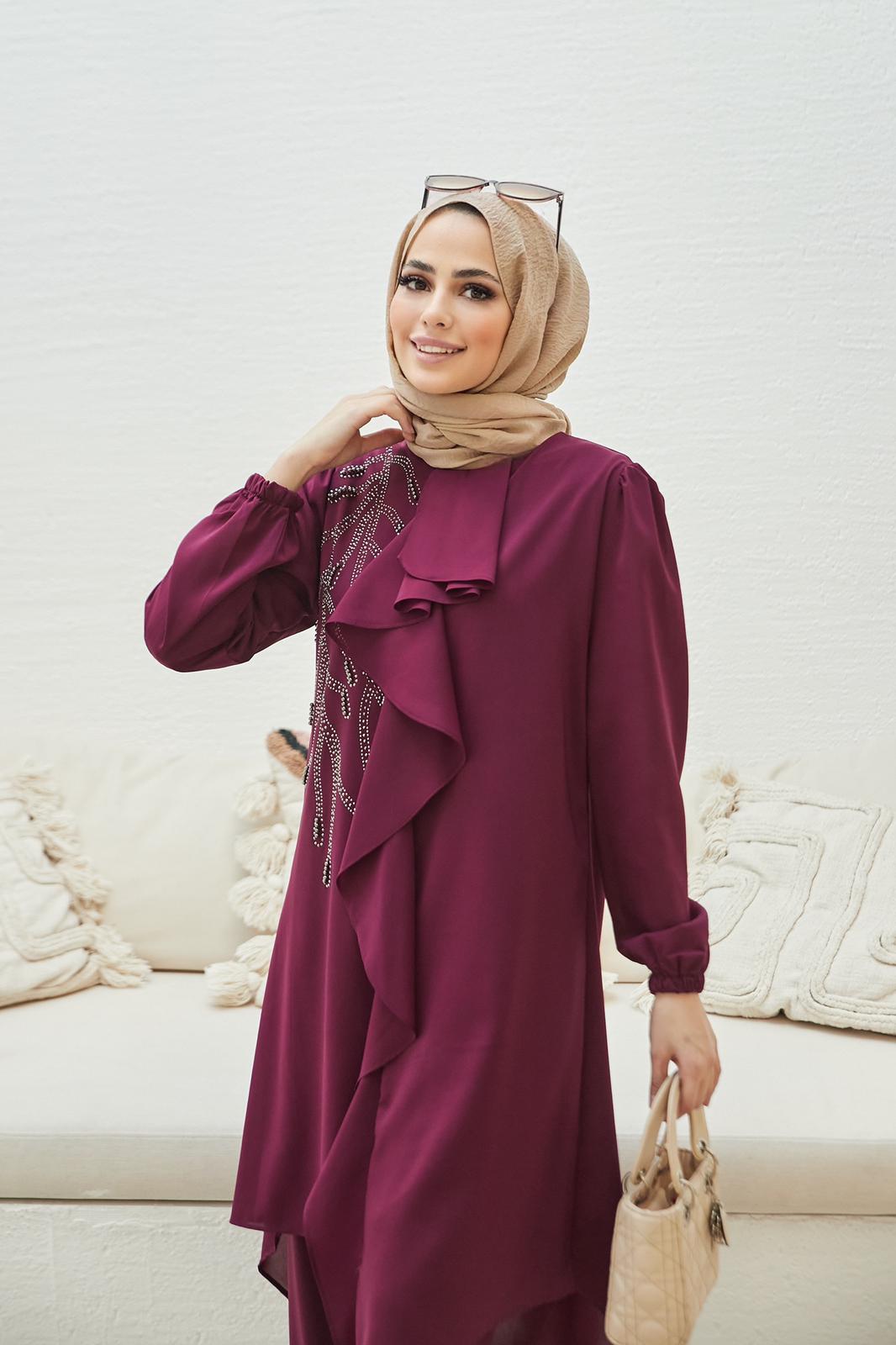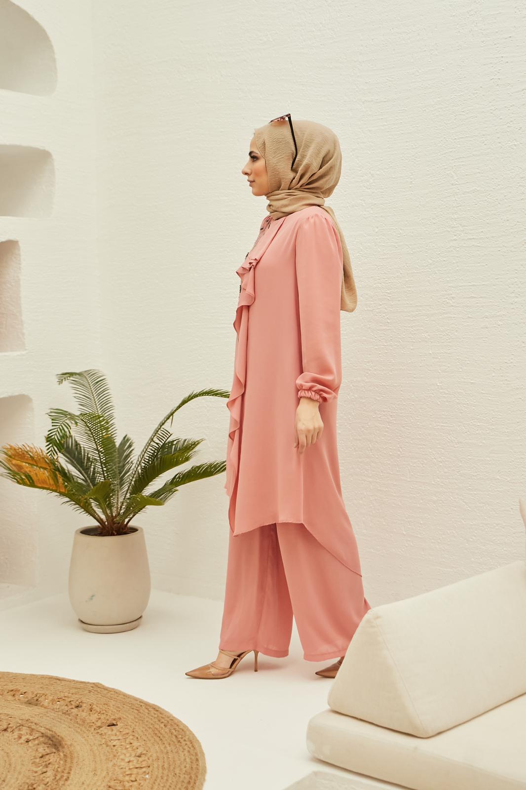 Tunik geometrik çizim desenli olup yaka fırfır ve pul detaylıdır kol ağızları lastiklidir