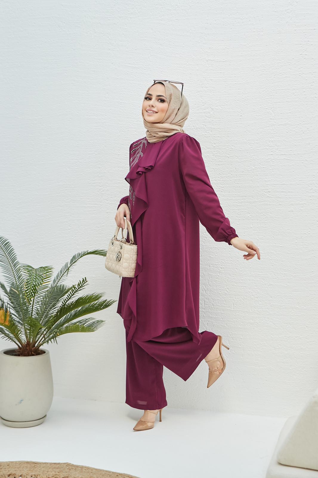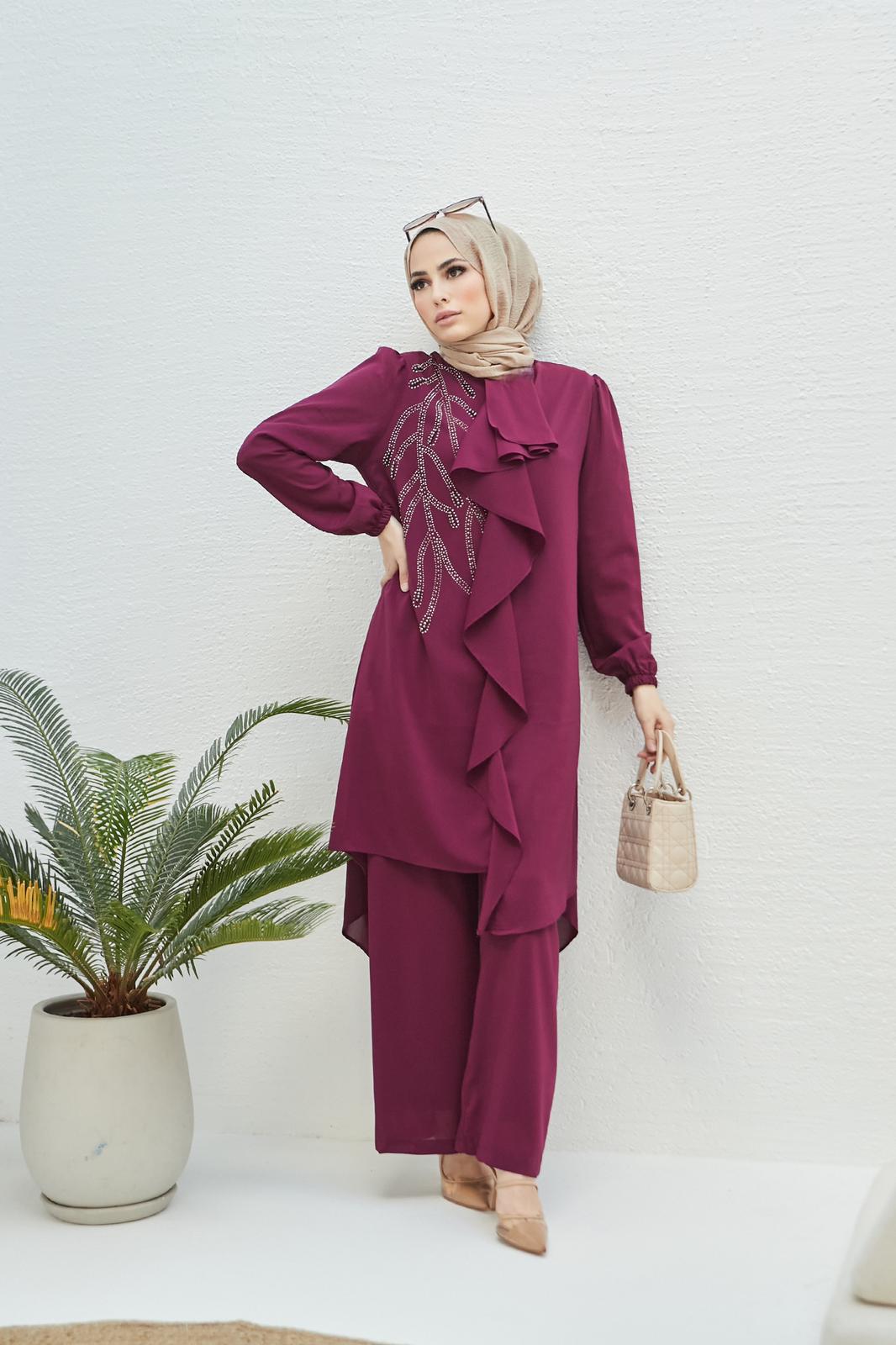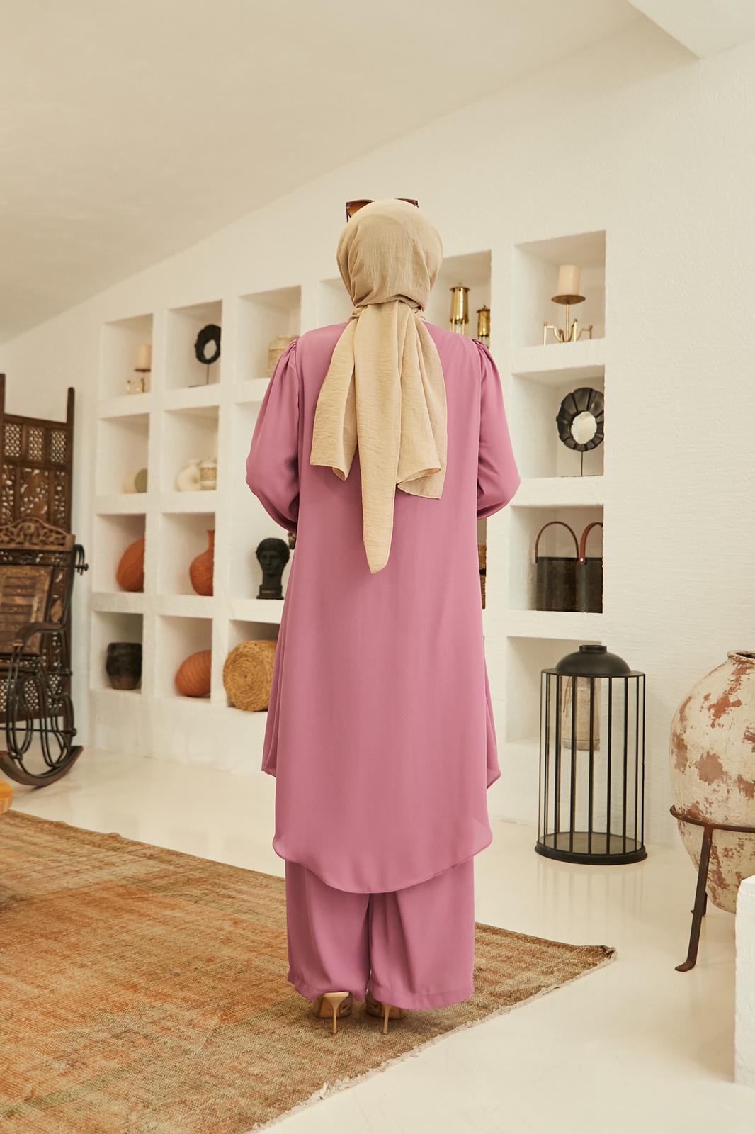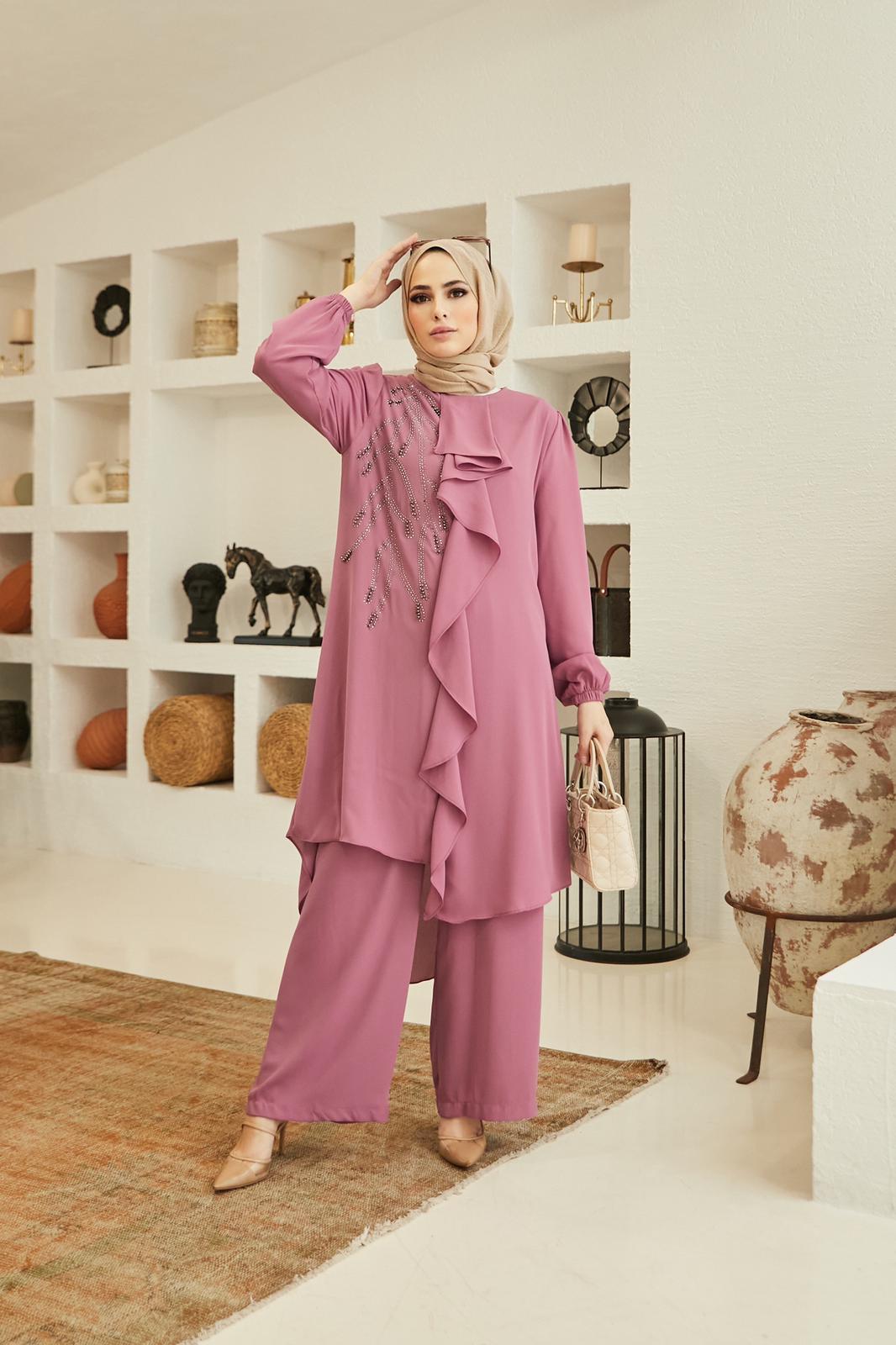 Tunik geometrik çizim desenli olup yaka fırfır ve pul detaylıdır kol ağızları lastiklidir